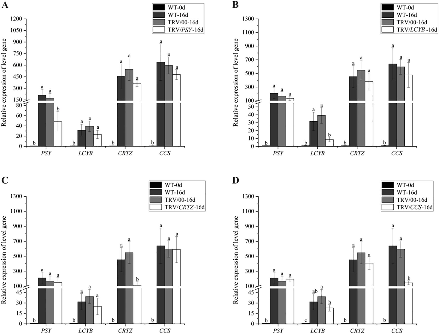 Bar graphs labeled A, B, C, and D, showing the relative expression of genes PSY, LCYB, CRTZ, and CCS under different conditions: WT-0d, WT-16d, TRV/00-16d, and TRV variant groups over sixteen days. Each graph compares these conditions using distinct gray shades with statistical annotations indicated by letters.