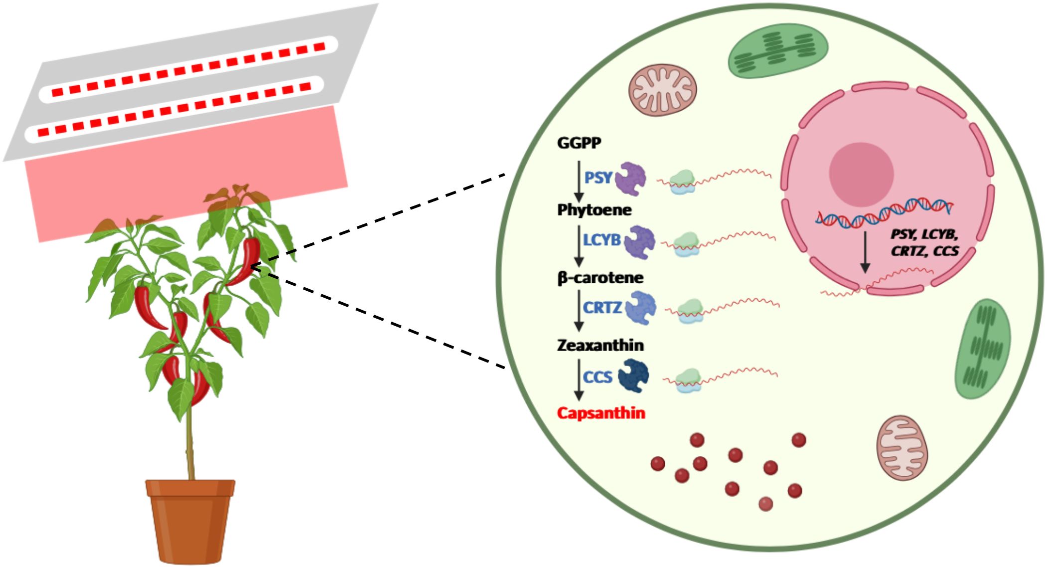 Figure 6. Schematic illustration of the pattern by which pre-harvest red LED light regulates fruit ripening and capsanthin accumulation in pepper (Created in https://BioRender.com).