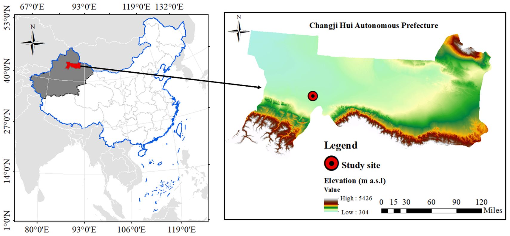Field experiments on winter wheat were conducted over two growing seasons from September 2022 to June 2024 at Huaxing Farm, Changji City, Changji Hui Autonomous Prefecture, Xinjiang, China (44°15′22″N, 87°15′34″E) (Figure 1). The study area is characterized by a typical inland desert climate, with a mean annual temperature of 6.6 °C, an average annual precipitation of 280 mm, a mean annual evaporation of 1,787 mm, and a total annual sunshine duration of 2,833 h.