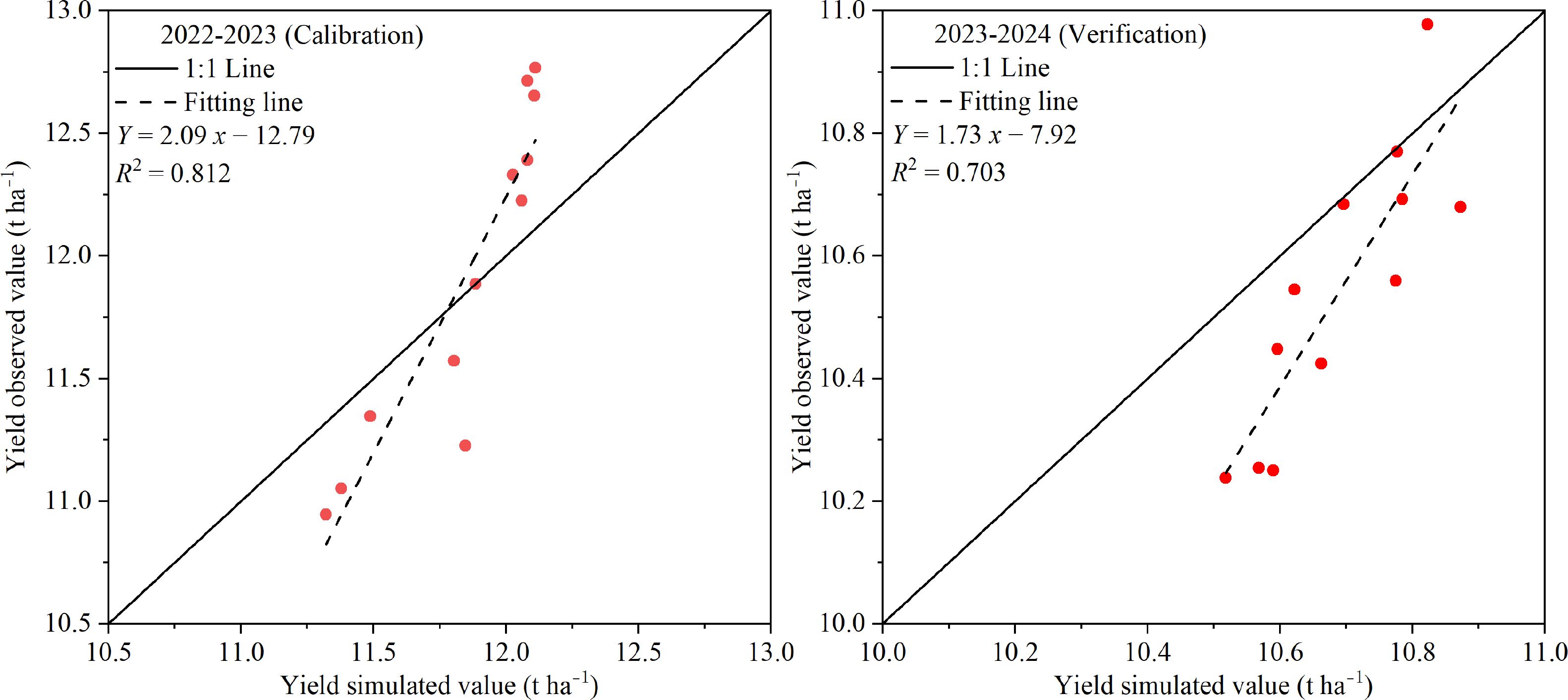 This study employed the Pearson-III distribution to analyze rainfall data during the winter wheat growing seasons from 1990 to 2020 in the study area. Based on this analysis, typical hydrological years were selected according to their exceedance probabilities: wet years (25% exceedance probability), normal years (50%), and dry years (75%) (Guo et al., 2021). Three representative years were chosen for simulation to assess the irrigation-induced yield potential of winter wheat: 1997–1998 (177 mm) as a wet year, 1999–2000 (134.8 mm) as a normal year, and 2005–2006 (98.5 mm) as a dry year.