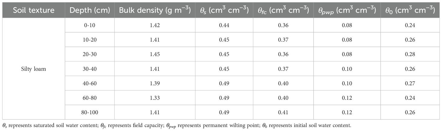 Before sowing winter wheat, ten sampling points were randomly selected within the experimental field. Soil samples were collected using a soil auger at seven depth intervals: 0–10, 10–20, 20–30, 30–40, 40–60, 60–80, and 80–100 cm. The samples were sealed in polyethylene bags, oven-dried, and analyzed to determine soil bulk density, field capacity, saturated water content, and initial soil water content (Table 2). Soil bulk density and initial water content were measured by cutting ring method and drying method, respectively. The cutting ring that contained the soil sample was placed in a container of pure water for 24 h to slowly absorb water and saturate it, before being removed to determine the soil saturated water content. Subsequently, the saturated cores were placed on dry soil to allow gravitational water to drain, and the soil field capacity was then measured. According to the USDA Soil Taxonomy, the soil texture of the experimental site was classified as silty loam. The two experimental seasons were conducted on the same plots, and the stratified mean soil parameters for each plot are listed in Table 2. The chemical properties of the topsoil (0–20 cm) were as follows: soil organic matter 11.3 g kg−1, available nitrogen 58.4 mg kg−1, available phosphorus 24.4 mg kg−1, and available potassium 229 mg kg−1. The measured soil physical and chemical properties were incorporated into the AquaCrop model to generate the soil input file (*.SOL).