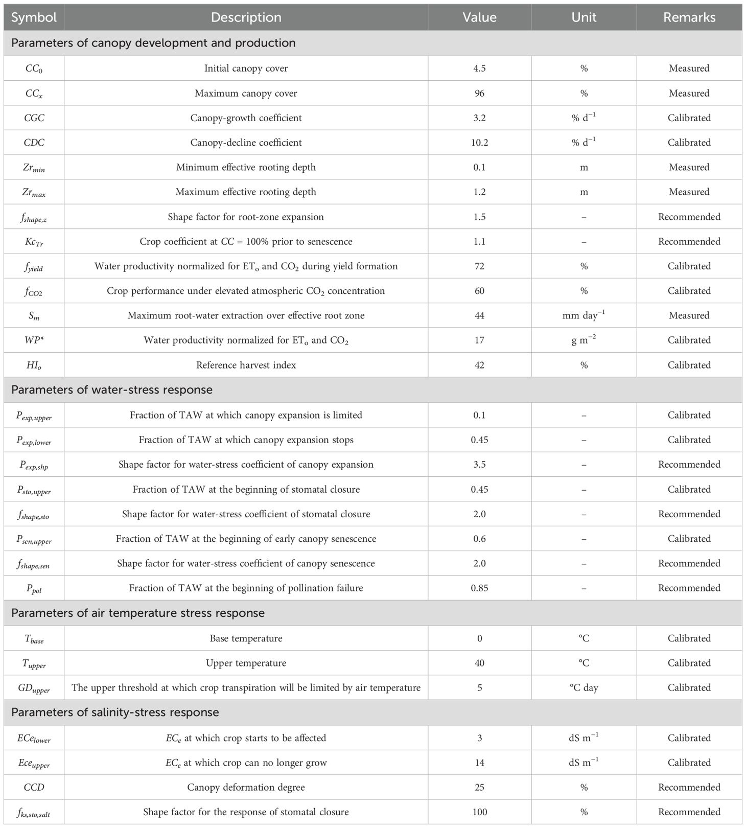 Determining crop parameters—including canopy development, aboveground biomass accumulation, yield formation parameters, and responses to water, temperature, and salinity stress—is essential for calibrating the AquaCrop model. Following the winter wheat parameters recommended in the AquaCrop model manual (Raes et al., 2009a), the model was calibrated using the observed data collected during the 2022–2023 winter wheat growing season. The main crop parameters used in the model are listed in Table 3. The canopy growth coefficient (CGC), canopy decline coefficient (CDC), normalized biomass water productivity (WP*), and reference harvest index (HI0) are key parameters controlling canopy dynamics, aboveground biomass accumulation, and yield formation in AquaCrop, and are generally considered constant for a given crop cultivar (Steduto et al., 2009). However, due to differences in cultivar characteristics and local climatic conditions, adjustments within the recommended parameter ranges are acceptable (Hsiao et al., 2009).