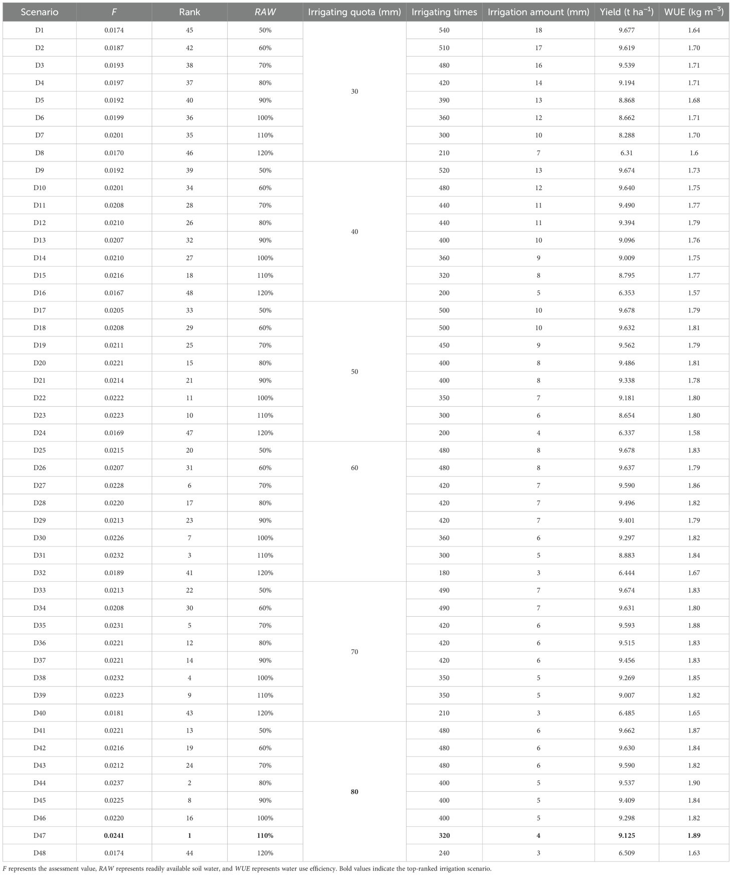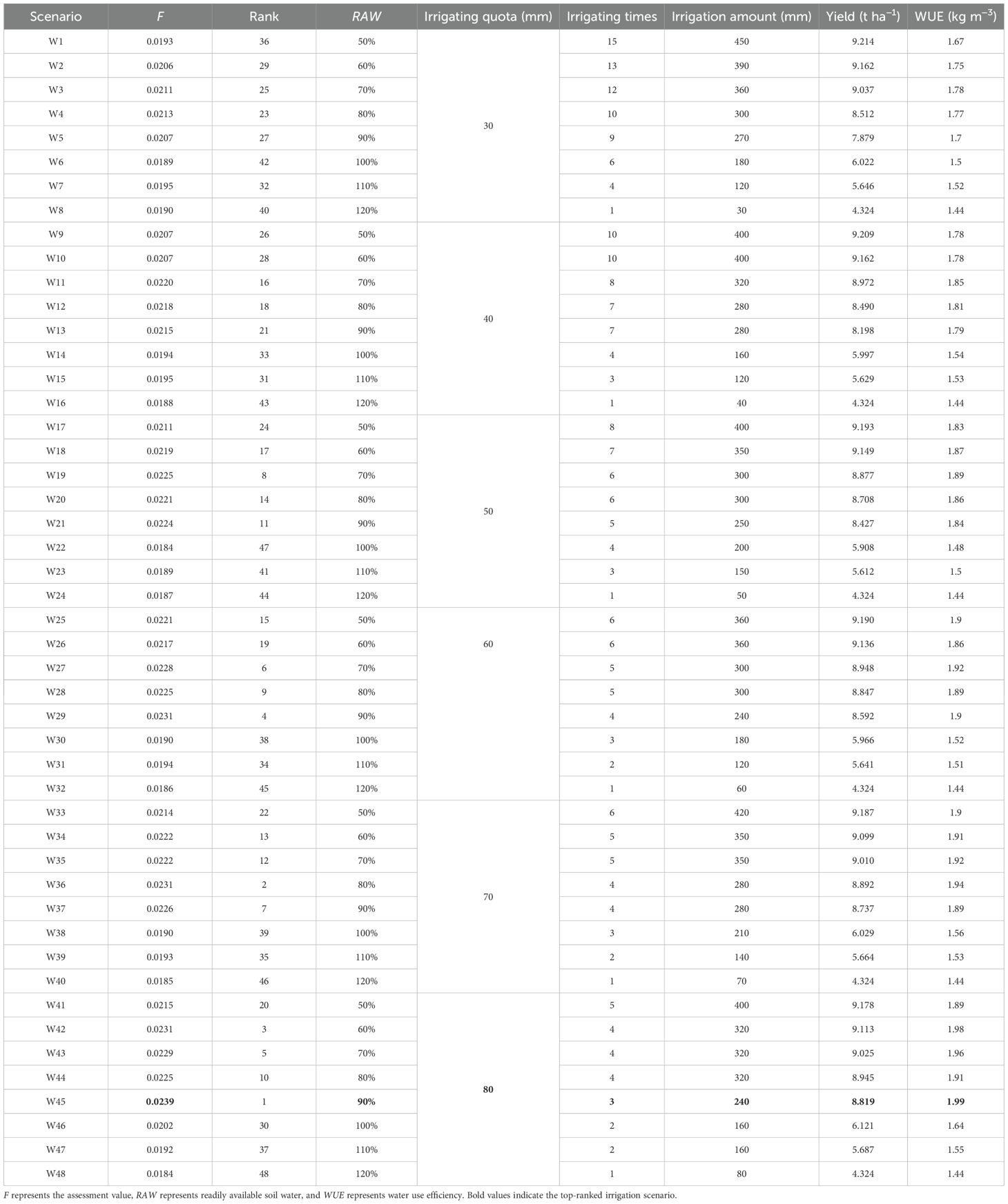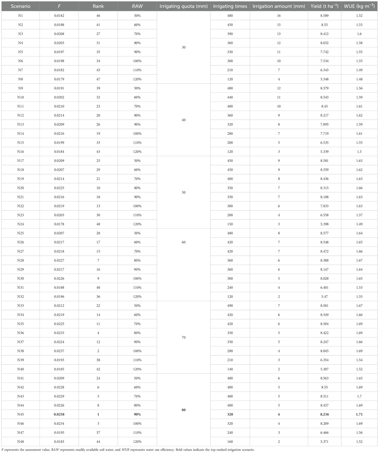 Tables 5, 6, 7 present the simulated yield and WUE of winter wheat under 48 irrigation scenarios for wet, normal, and dry years. The results show that the highest-yielding irrigation scheduling required 15, 16, and 18 irrigation events in wet, normal, and dry years, respectively, with an irrigation depth of 30 mm per event and a readily available water (RAW) of 50%, representing the lower control limit of RAW. In contrast, the highest WUE was achieved with only 3, 4, and 5 irrigation events in wet, normal, and dry years, respectively, with higher soil water depletion thresholds (RAW of 90%, 90%, and 80%) and a larger irrigation depth of 80 mm per event.