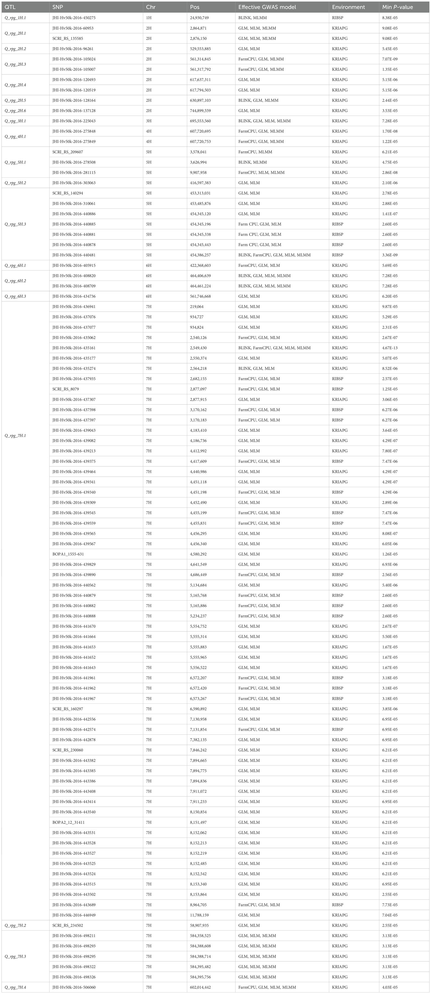 Among the identified loci, Q_rpg_5H.3 and Q_rpg_7H.1 were consistently detected by all five GWAS models across both environments. The QTLs Q_rpg_3H.1, Q_rpg_6H.2, and Q_rpg_7H.4 were identified by four models, while nine QTLs were detected using three models, and two models supported the remaining 15 QTLs. The lowest P-values, below the Bonferroni-corrected threshold (P=1.57E-6), were observed for five QTLs: Q_rpg_2H.3, Q_rpg_4H.1, Q_rpg_5H.1, Q_rpg_5H.3, and Q_rpg_7H.1 (Table 1), indicating a strong association with SR resistance. The QTL Q_rpg_7H.1 encompassed the highest number of associated SNPs, totaling 60.