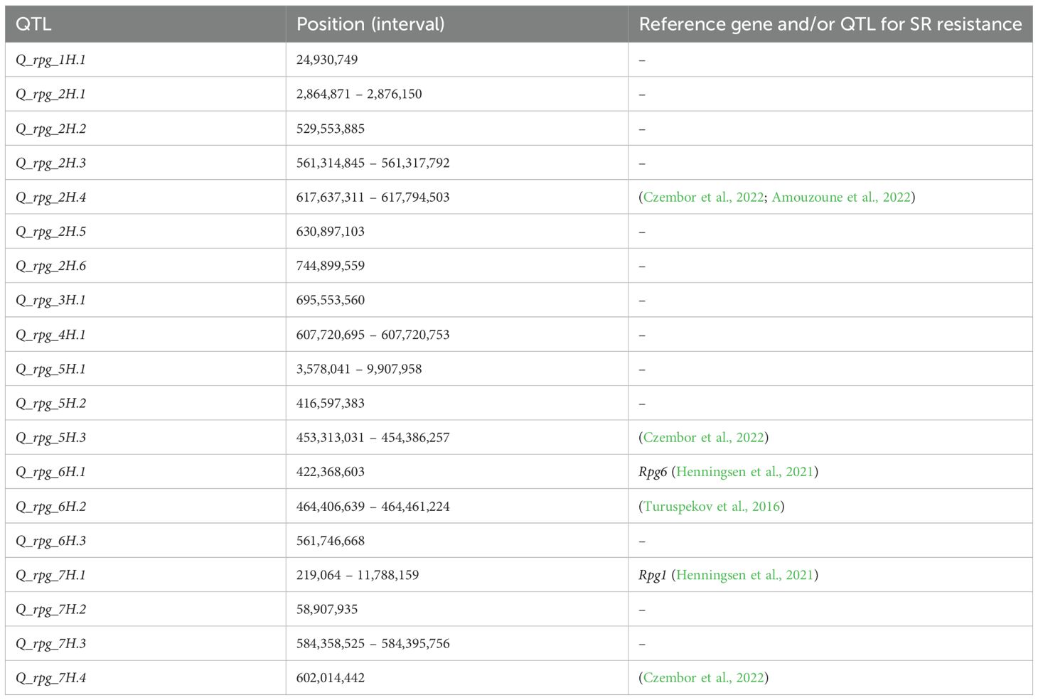 Genetic positions of 19 QTLs mapped across all seven barley chromosomes were compared with positions of known Rpg genes and SR-resistance QTLs from the literature (Table 2).