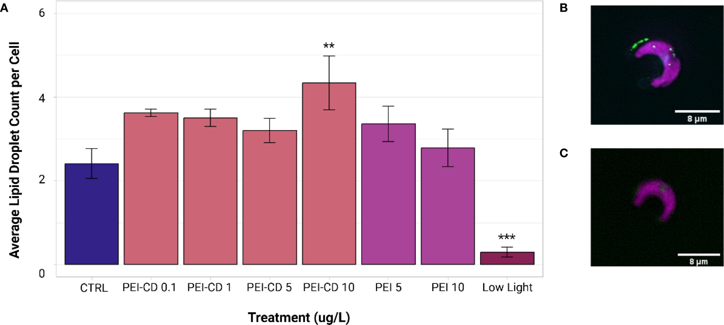 Figure 5. (A) Mean lipid droplet count per cell of PEI and low light treatments, obtained from ImageXpress data analyzed in MetaXpress. Asterisks indicate significant difference from the control (ANOVA and Dunnett’s test post-hoc, p<0.05, n=8-10). Error bars represent standard error. Graph created with ggplot2 (Wickman, 2016). (B) Image of a cell with lipid droplets present, edited in Fiji (Schindelin et al., 2012). (C) Example of cell without lipid droplets present, edited in Fiji (Schindelin et al., 2012). Lipid droplet size data is available in the Supplementary Information (Supplementary Figure S4).