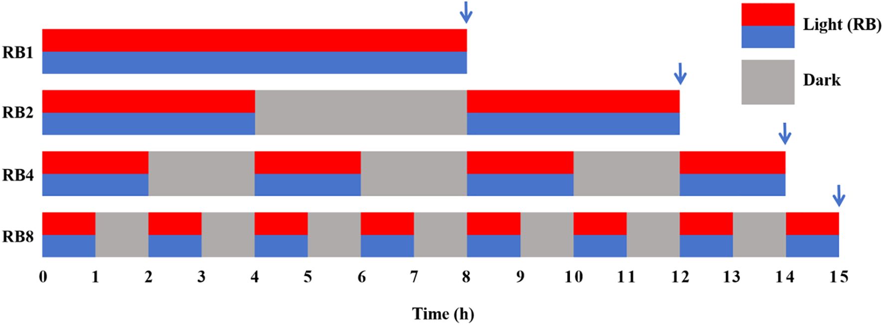 Methods: Four treatments were applied: RB1 (continuous illumination), RB2 (4 h light/4 h dark/4 h light), RB4 (three cycles of 2 h light/2 h dark plus a final 2 h light), and RB8 (seven cycles of 1 h light/1 h dark with a final 1 h light).