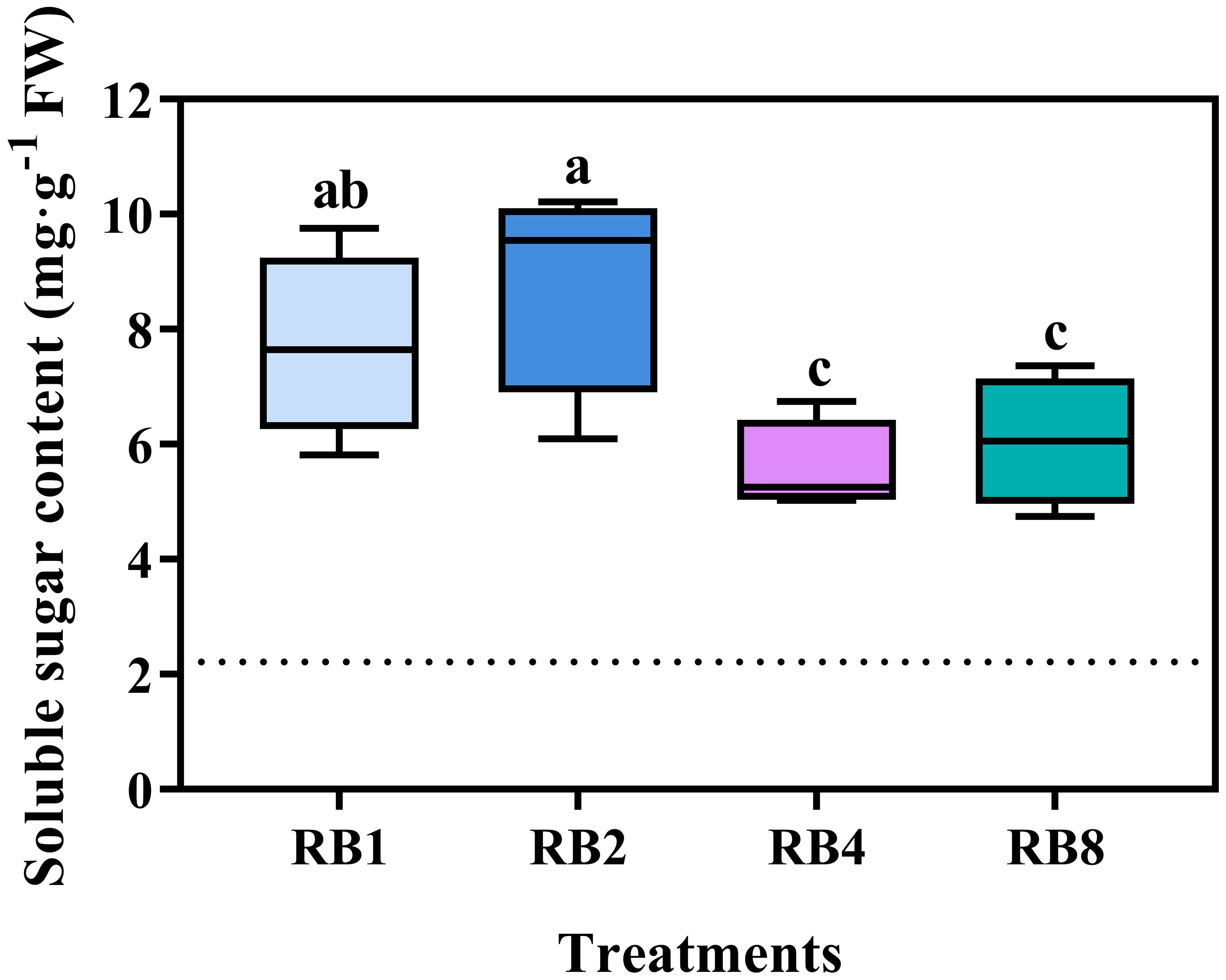 Figure 4. Soluble sugar content in lettuce leaves of plants grown under different light treatments at the end-of-production (EOP) stage: RB1 (continuous illumination), RB2 (4 h light followed by 4 h dark and concluding with a final 4 h light), RB4 (three cycles of 2 h light/2 h dark plus a final 2 h light), and RB8 (seven cycles of 1 h light/1 h dark with a final 1 h light). The dotted line indicates the sampling before EOP irradiation. Different letters indicate significant differences using Duncan’s multiple range test (p < 0.05; n = 4).