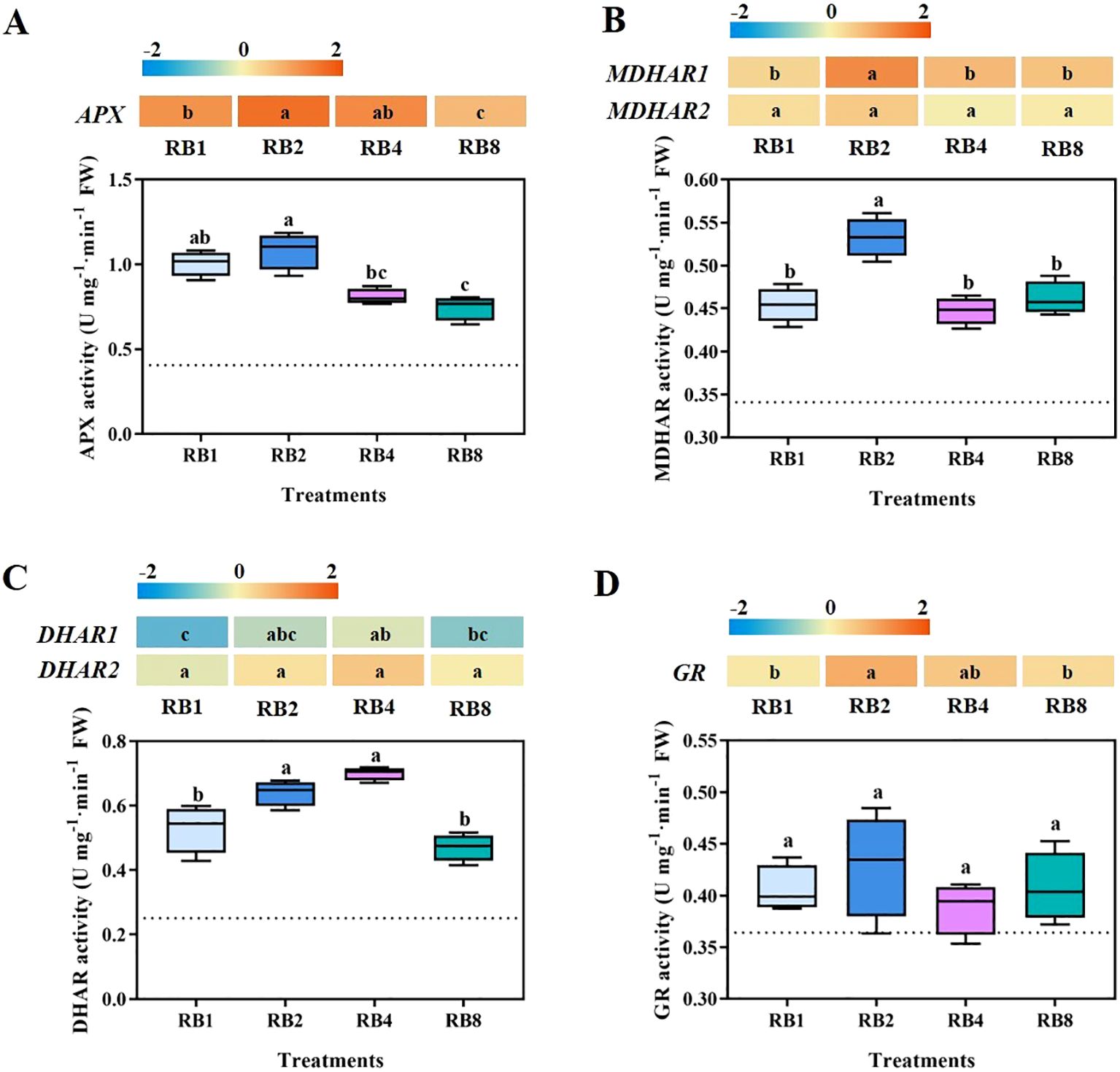 Figure 3. Key enzyme activities (including APX, MDHAR, DHAR, and GR) and expression of related genes (including APX, MDHAR1, MDHAR2, DHAR1, DHAR2, and GR) involved in AsA cycling of plants grown under different light treatments at the end-of-production (EOP) stage. RB1 (continuous illumination), RB2 (4 h light followed by 4 h dark and concluding with a final 4 h light), RB4 (three cycles of 2 h light/2 h dark plus a final 2 h light), and RB8 (seven cycles of 1 h light/1 h dark with a final 1 h light). The dotted line indicates the sampling before EOP irradiation. Different letters indicate significant differences using Duncan’s multiple range test (p < 0.05; n = 4). Gene expression analyses were performed with four biological replicates, each including three technical replicates.