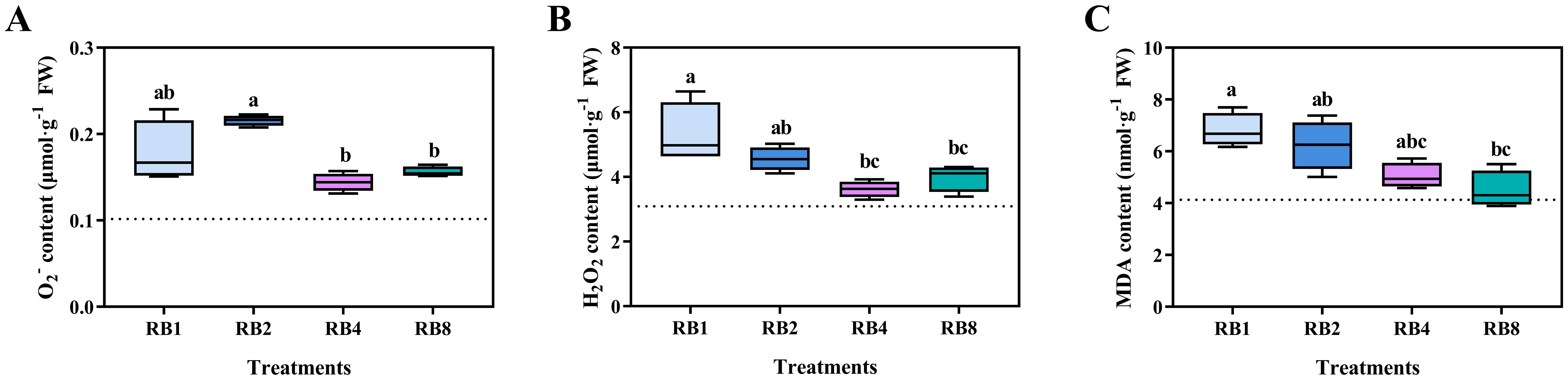 Figure 5. O2- (A), H2O2 (B), and MDA (C) contents in lettuce leaves of plants grown under different light treatments at the end-of-production (EOP) stage: RB1 (continuous illumination), RB2 (4 h light followed by 4 h dark and concluding with a final 4 h light), RB4 (three cycles of 2 h light/2 h dark plus a final 2 h light), and RB8 (seven cycles of 1 h light/1 h dark with a final 1 h light). The dotted line indicates the sampling before EOP irradiation. Different letters indicate significant differences using Duncan’s multiple range test (p < 0.05; n = 4).