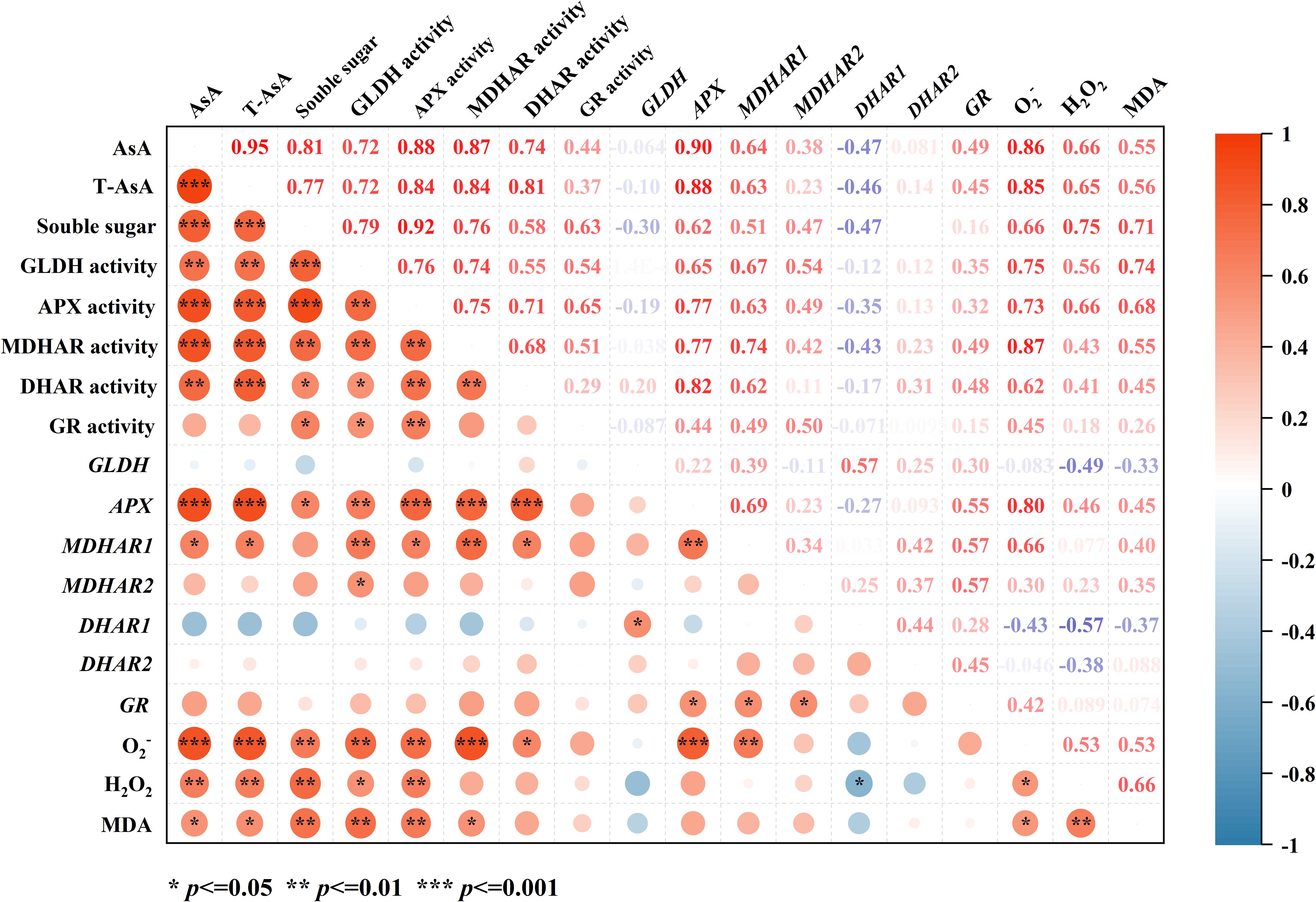 Figure 6. Correlation heatmap of the contents of AsA, T-AsA, soluble sugar, O2-, H2O2, MDA, as well as the activities and gene expression levels of GLDH, APX, DHAR, MDHAR, and GR in hydroponic lettuce under different light/dark alternating frequencies at the EOP light treatment. The color scale indicates the strength and direction of correlations (red: positive; blue: negative). Significance levels are denoted as *p < 0.05, **p < 0.01, ***p < 0.001.
