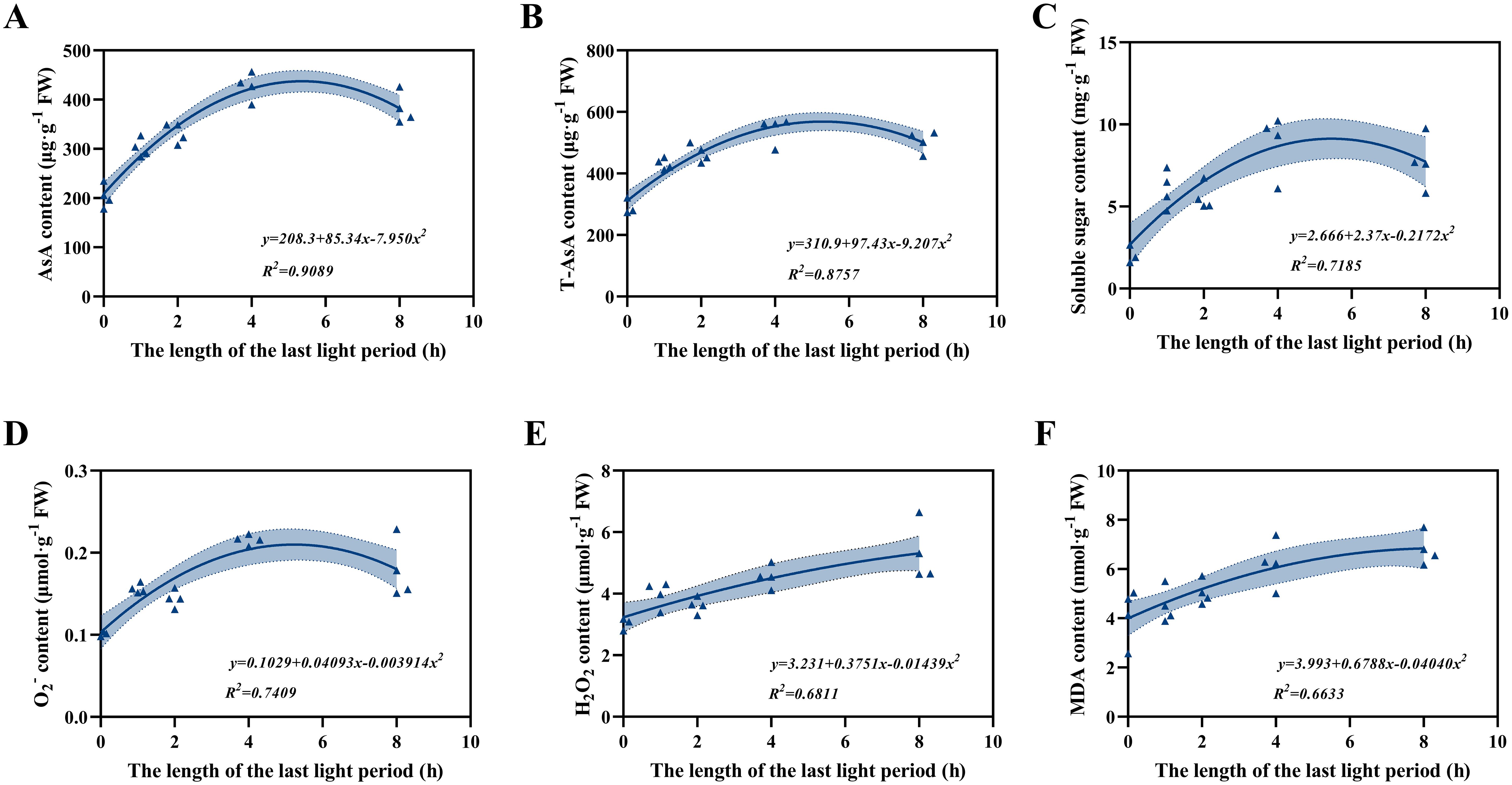 Figure 7. Fitting analysis of the relationships between the duration of the final light period and contents of AsA (A), T-AsA (B), soluble sugar (C), O2- (D), H2O2 (E), and MDA (F) in lettuce leaves. Each data point represents an individual biological replicate (n = 4). Regression equations and coefficients of determination (R2) are shown in each panel; shaded areas indicate 95% confidence intervals.