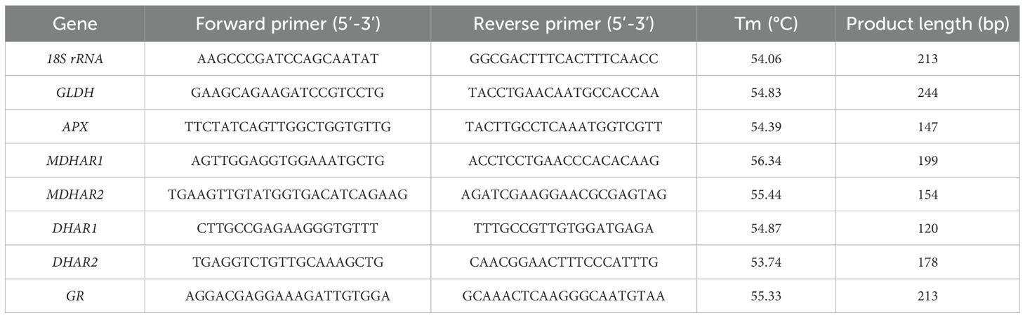 GLDH activity was determined using a commercial assay kit (Beijing Solarbio Science & Technology Co., Ltd.; Product No. BC1250; the kit is based on the principle that GLDH catalyzes the reduction of oxidized cytochrome c (Cytc) by L-galactonolactone. Reduced Cytc has a characteristic absorption peak at 550 nm, and GLDH activity is calculated by measuring the rate of increase in reduced Cytc; Website: https://www.solarbio.com) following the manufacturer’s protocol. Ascorbate peroxidase (APX) activity was analyzed following the method of Zha et al. (2019a). Frozen leaf tissue (0.3 g) was homogenized as described above. The homogenate was mixed with 2 mL of ice-cold extraction buffer [100 mM potassium phosphate (pH 7.0), 0.2 mM EDTA, 1 mM ascorbic acid (AsA)] and sonicated for 10 min in an ice bath. After centrifugation at 15,000 × g (4°C, 10 min), 0.1 mL of supernatant was reacted with 2.9 mL of reaction mixture containing 50 mM potassium phosphate (pH 7.8), 0.5 mM AsA, and 0.25 mM H2O2. The reaction was initiated by adding the enzyme extract, and the absorbance of the reaction mixture was measured at 290 nm. One unit of enzyme was defined as the amount that oxidized 1 μmol of AsA per min. The activities of dehydroascorbate reductase (DHAR), monodehydroascorbate reductase (MDHAR), and glutathione reductase (GR) were assayed according to Ma and Cheng (2004), with minor modifications. Frozen leaf tissue (0.1 g) was homogenized as described above. After grinding, 1 mL ice-cold extraction buffer [50 mM potassium phosphate buffer (pH 7.5), 1 mM DTT, 0.1% (v/v) Triton X-100, 0.2% (v/v) β-mercaptoethanol, 2% (w/v) polyvinylpyrrolidone, 1 mM EDTA] was added, followed by 10 min ice-bath sonication. The homogenate was centrifuged at 15,000 × g (4°C, 20 min). DHAR activity: 0.1 mL of supernatant was mixed with 2.9 mL of reaction mixture containing 100 mM HEPES-KOH (pH 7.0), 2.5 mM glutathione (GSH), 1 mM EDTA, and 0.6 mM dehydroascorbic acid (DHA). The reaction was initiated by adding the enzyme extract, and absorbance was recorded at 265 nm. One unit of the enzyme was defined as the amount that reduced 1 μmol of DHA per min. MDHAR activity: 0.1 mL of supernatant was combined with 2.9 mL of reaction mixture [50 mM HEPES-KOH (pH 7.6), 0.3 mM NADH, 0.5 mM AsA, 0.5 U ascorbate oxidase (AO)]. The reaction was initiated by adding AO, and absorbance was monitored at 340 nm. One unit of the MDHAR was defined as the amount that oxidized 1 μmol of NADH per min. GR activity: 0.1 mL of supernatant was reacted with 2.9 mL of reaction mixture [100 mM Tris-HCl (pH 8.0), 1 mM EDTA, 3 mM oxidized glutathione (GSSG), 0.6 mM NADPH]. The reaction was started by adding NADPH, and absorbance was measured at 340 nm. One unit of the enzyme was defined as the amount that oxidized 1 μmol of NADPH per min.