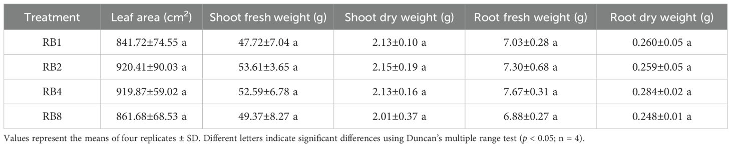 Table 2. The leaf area, shoot fresh weight, shoot dry weight, root fresh weight, and root dry weight of lettuce plants grown under different light treatments at the end-of-production (EOP) stage: RB1 (continuous illumination), RB2 (4 h light followed by 4 h dark and concluding with a final 4 h light), RB4 (three cycles of 2 h light/2 h dark plus a final 2 h light), and RB8 (seven cycles of 1 h light/1 h dark with a final 1 h light).