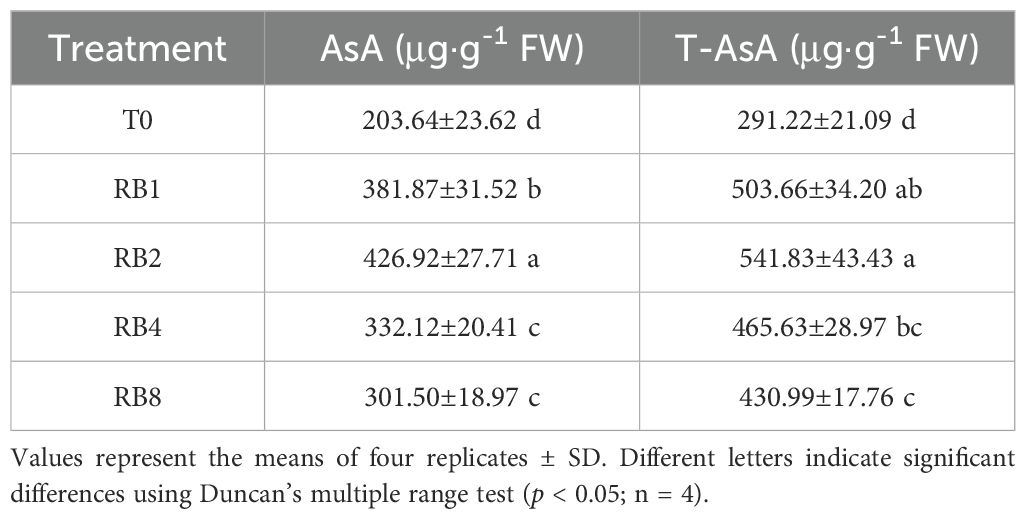 After 8 h light treatment exposure with different light/dark cycle frequencies. The RB2 treatment induced the highest AsA accumulation (426.9 μg·g-1 FW), with increases of 11.8%, 28.5%, and 41.6% compared to the RB1, RB4, and RB8 treatments, respectively. Similarly, RB2 achieved maximum T-AsA content, exceeding RB1, RB4, and RB8 by 7.6%, 16.4%, and 25.7%, respectively (Table 3).