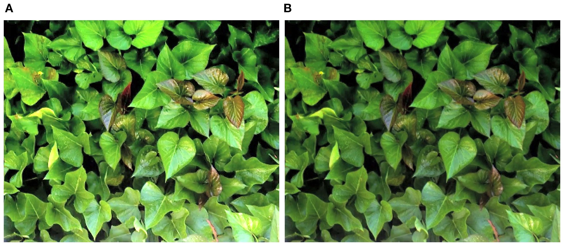 Figure 1. Images processed using the developed calibration program ((A) raw image, (B) color-calibrated image).