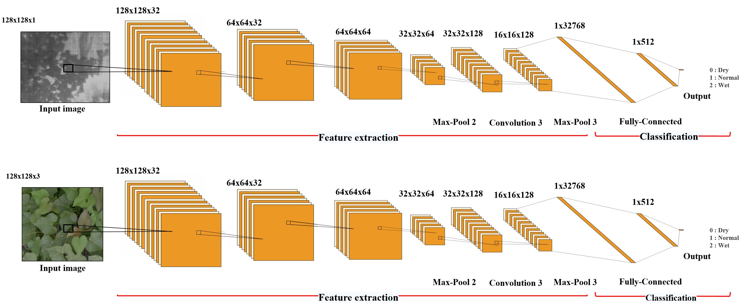 A total of 904 images, comprising 452 thermal image and 452 RGB images, were used. The dataset was composed of SD (156), D (150), O (150), W (137), and SW (146) images. The data were split into 80% for training and 20% for testing. To ensure stable model performance, k-fold cross-validation was applied. As shown in Figure 2, all input images were resized to 128×128 pixels and normalized to the [0, 1] range by dividing the pixel values by 255. RGB images were loaded in “RGB” mode and thermal images in “grayscale” mode, with preprocessing tailored to each sensor type.