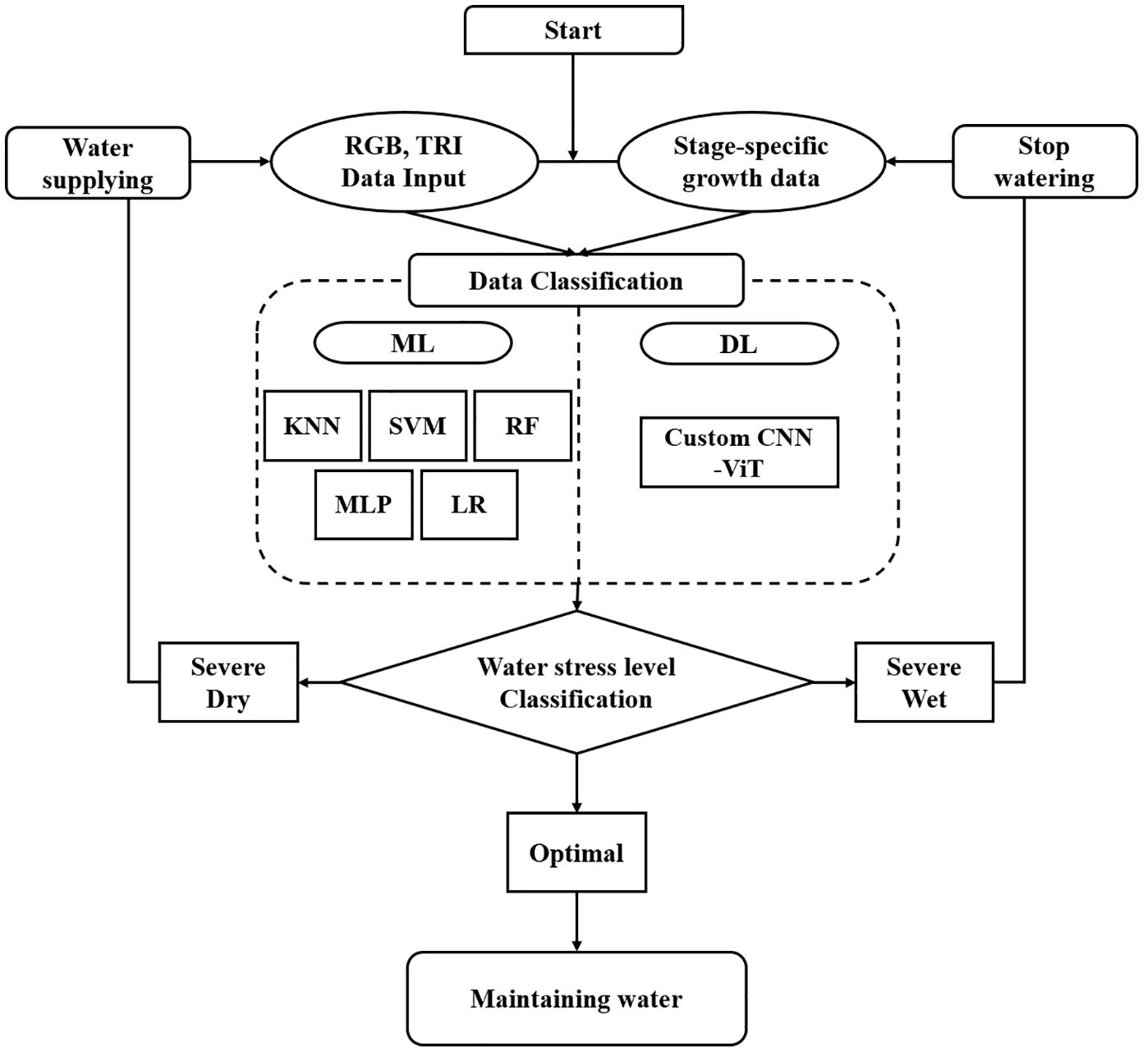 The ML-based KNN model demonstrated stable classification performance, particularly for moderate water stress levels, by leveraging quantitative growth indicators. In contrast, the DL-based model exhibited high sensitivity in extreme stress conditions. Notably, the KNN model achieved the highest classification accuracy across all growth stages, which can be attributed to its structural compatibility with quantitative data.
