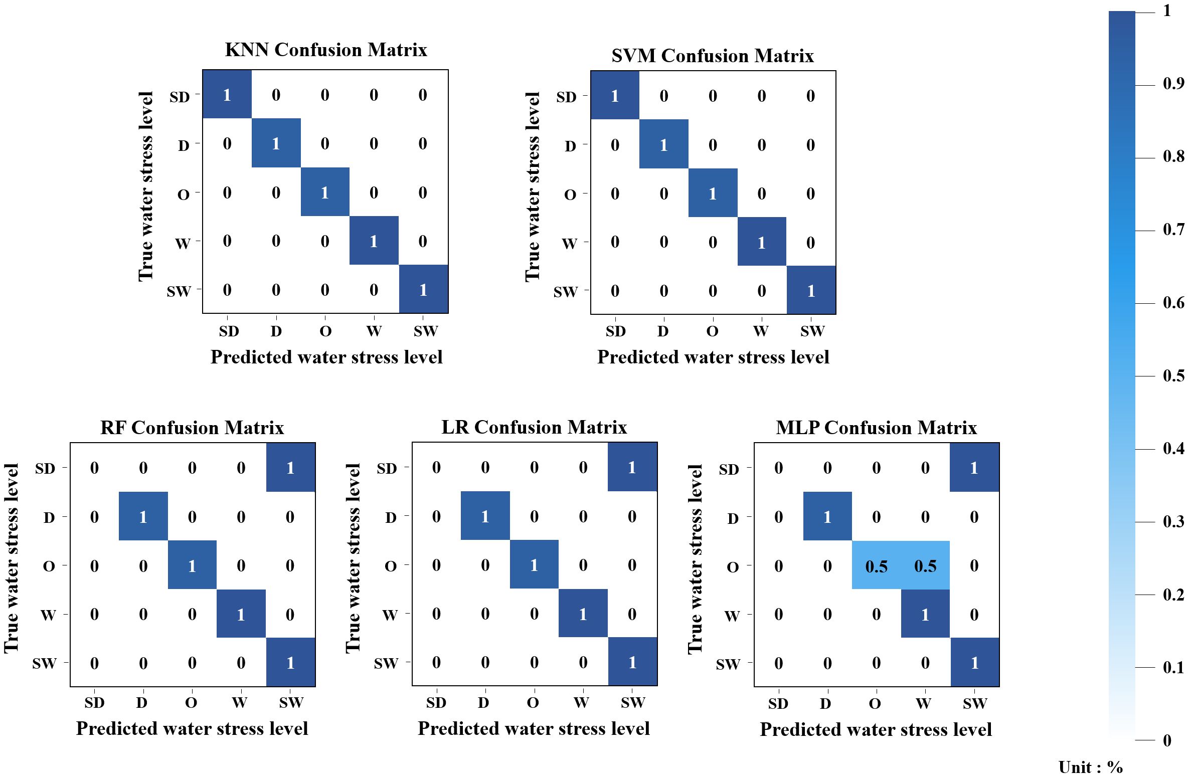 The ML models for classifying sweet potato water stress levels were trained separately for each growth stage using five algorithms: LR, RF, KNN, MLP, and SVM. In June, as shown in Figure 4, both KNN and SVM achieved perfect classification accuracy (1.0), while RF and LR each recorded a value of 0.84, and MLP showed lower performance at 0.67. In the RF and LR models, samples from the SD class were misclassified as SW, indicating decreased classification performance in distinguishing extreme water levels. MLP also showed similar misclassification patterns, with 50% of O-class samples incorrectly classified as W-class. These results suggest that the models had difficulty distinguishing between certain adjacent classes, which may be attributed to overlapping feature characteristics or an imbalanced data distribution.