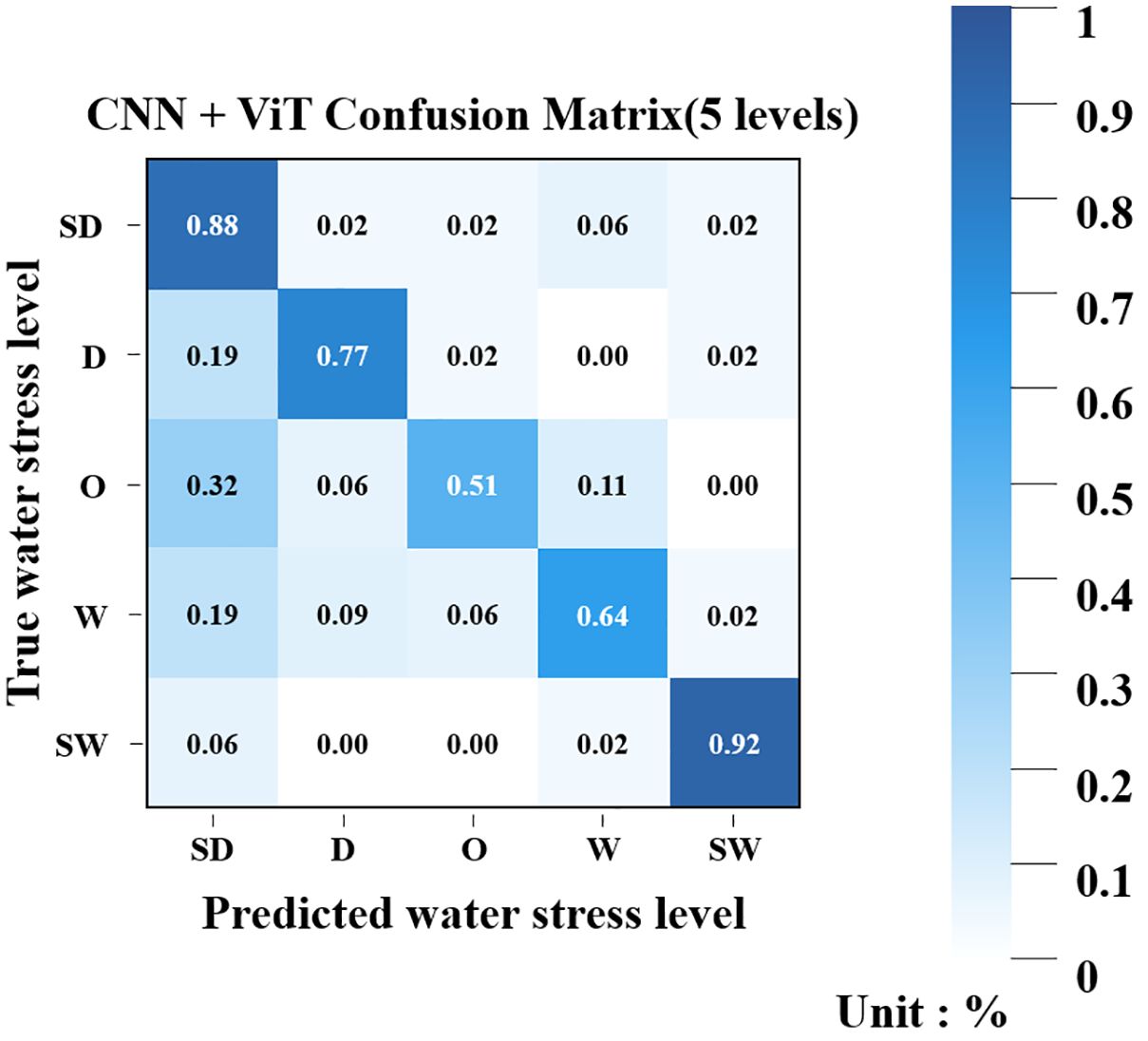 The experimental results revealed that when the water stress levels were classified into five categories, the model achieved a relatively low accuracy of 0.75 with an elevated loss of 0.7. By contrast, simplifying the stress levels into three categories (SD, O, SW) substantially improved classification accuracy to 0.92, with 5-fold cross-validation confirming robust performance at an average accuracy of 0.91. The confusion matrices further showed that both the SD and SW classes were identified with 100% accuracy, while the O class reached 97%, with only 3% of the samples misclassified as SD.