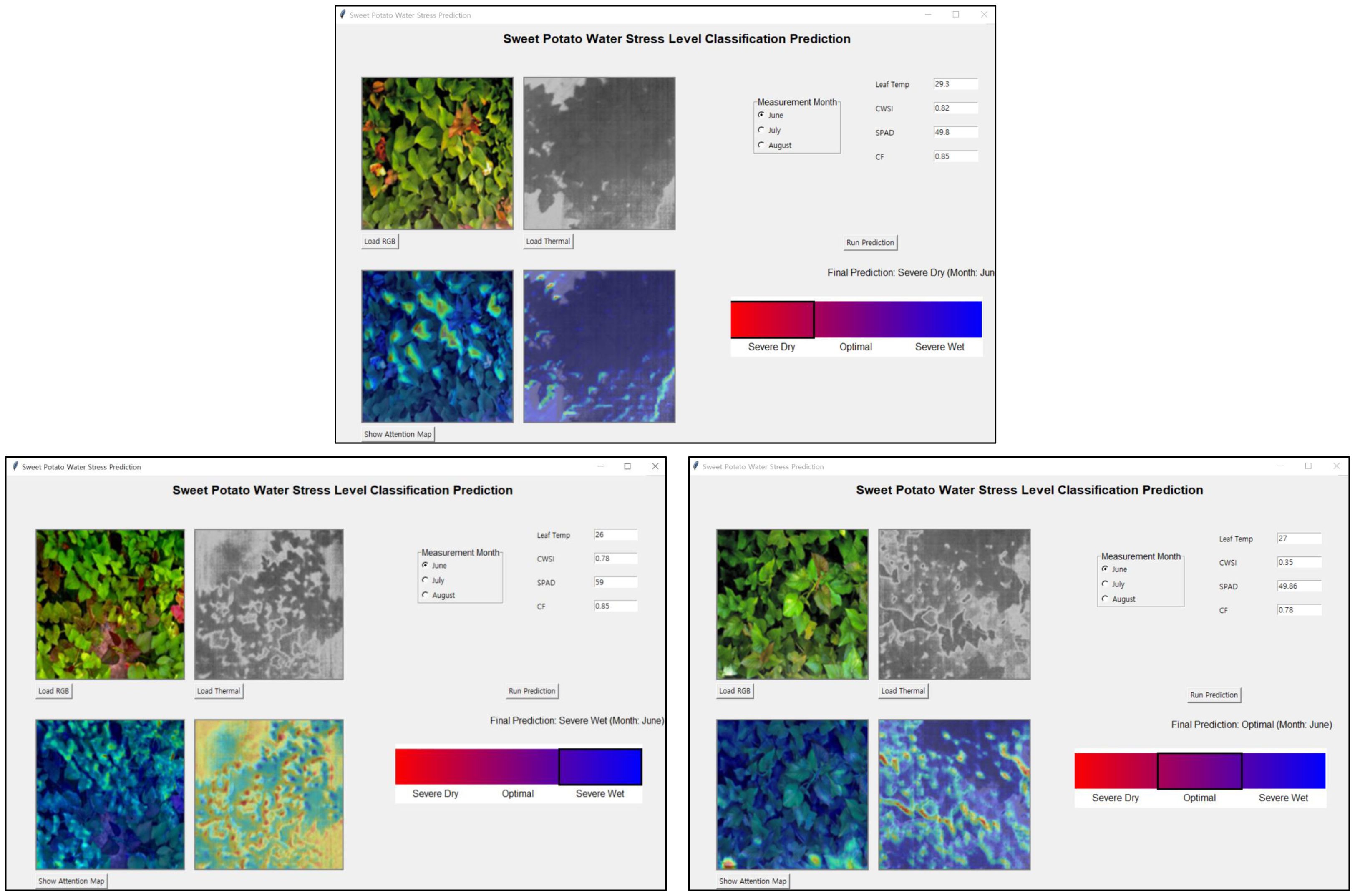 In this study, a sweet potato water monitor system was developed by integrating the KNN model with the CNN-based ViT model to effectively classify the water stress levels of sweet potato crops (Figure 10). The developed system is a deep learning-based RGB–thermal CNN+ViT prediction framework designed to visualize and predict water stress levels in sweet potato crops, consisting of four main interface components. It requires only modest computational resources (≈30.5M parameters; ~122 MB in fp32) and operates in near real time on a CPU, with GPU acceleration further reducing latency. Moreover, Grad-CAM explanations are computed on-the-fly with moderate overhead, enabling practical field deployment with consumer-grade hardware.