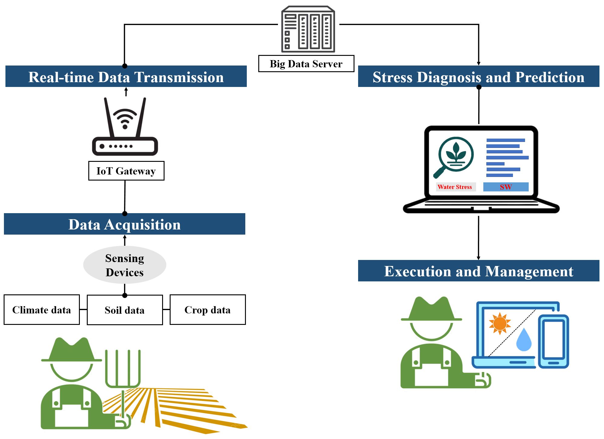 Crop water stress traditionally has been evaluated through direct measurement of photosynthetic activity under field conditions or by monitoring soil moisture levels in conjunction with meteorological parameters (Ihuoma and Madramootoo, 2017). However, such methods are often labor-intensive and time-consuming and consequently are not practical for large-scale or continuous monitoring (Yang et al., 2020). Furthermore, these approaches are frequently constrained by subjectivity in data collection and interpretation, which may lead to inconsistencies between observers and experimental conditions (Grassini et al., 2015). In light of this, there is a growing need to develop new technologies that can overcome the limitations of traditional methods and enable more efficient and accurate assessment of water stress (Kamarudin et al., 2021). Recently, the integration of remote sensing technologies, sensor-based measurements, and artificial intelligence (AI) analysis techniques in agricultural field has made it possible to monitor crop growth conditions rapidly, precisely, and at early stages (Wei et al., 2023).