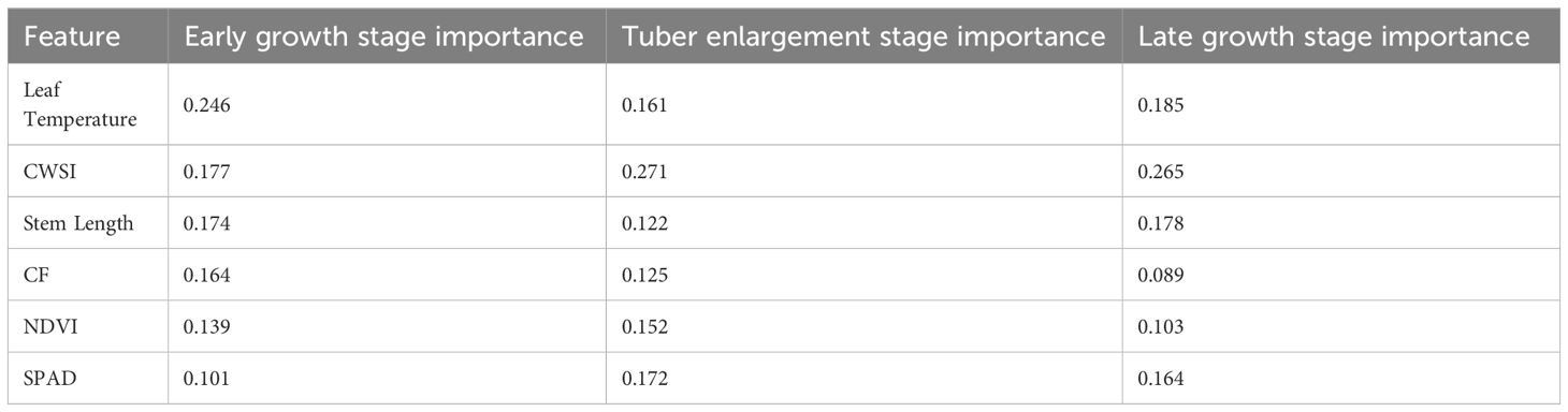 As shown in Table 1, a total of four growth indicators with the highest contribution scores were selected using RF. For the early growth stage, the selected variables were leaf temperature, CWSI, stem length, and CF. For the tuber bulking stage, the most influential indicators were CWSI, SPAD, leaf temperature, and NDVI. Lastly, for the late growth stage, the selected variables were CWSI, stem length, leaf temperature, and CF. Through this analysis, the most influential variables in terms of crop growth and yield prediction were identified, establishing a foundation for optimizing model performance.