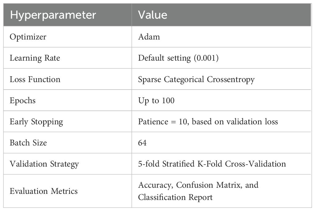 A 5-fold cross-validation procedure was employed to account for the limited dataset size. To mitigate evaluation bias under class imbalance, a stratified scheme was applied so that each fold preserved the original class distribution. The data were shuffled at each split, and a fixed random seed (e.g., random_state = 42) was used to ensure reproducibility. In each fold, approximately 80% of the data were allocated for training and 20% for validation. All preprocessing steps (e.g., feature scaling) were fitted on the training subset only and subsequently applied to the corresponding validation subset to prevent data leakage. For fair comparison, the same fold partitions were consistently applied across all models. Performance metrics, including accuracy, macro/weighted F1-score, precision, and recall, were reported as mean ± standard deviation across the five folds.