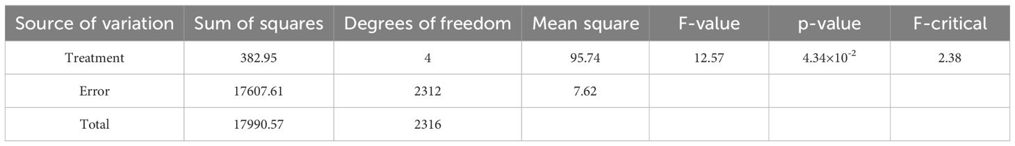 To evaluate the statistical significance of the leaf temperature data after removing outliers, an analysis of variance (ANOVA) was performed. This statistical method is used to compare data groups based on a single independent variable (group or category). In this study, ANOVA was used to determine whether mean leaf temperatures significantly differed among the five water stress levels. As shown in Table 3, the analysis resulted in an F-statistic of 2.376 and a p-value of 0.043. Because the p-value is less than 0.05, it indicates that the mean leaf temperature differs significantly across water stress classes. In other words, the leaf temperature of sweet potatoes varies depending on the water treatment level.