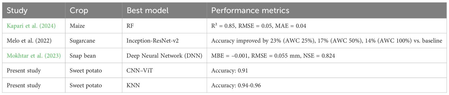 In the present study, a systematic classification of sweet potato water stress levels was conducted by incorporating multiple growth indicators along with leaf temperature data. Among the ML models, KNN achieved the highest performance, reaching an accuracy of 1.00 across all growth stages, while maintaining strong results in 5-fold cross-validation (0.94, 0.96, and 0.94). Furthermore, the integration of RGB and thermal images using a CNN+ViT model demonstrated superior performance, achieving an accuracy of 0.97, with a 5-fold cross-validation result of 0.91. These reported results were then compared with the findings of the present study, as summarized in Table 4.