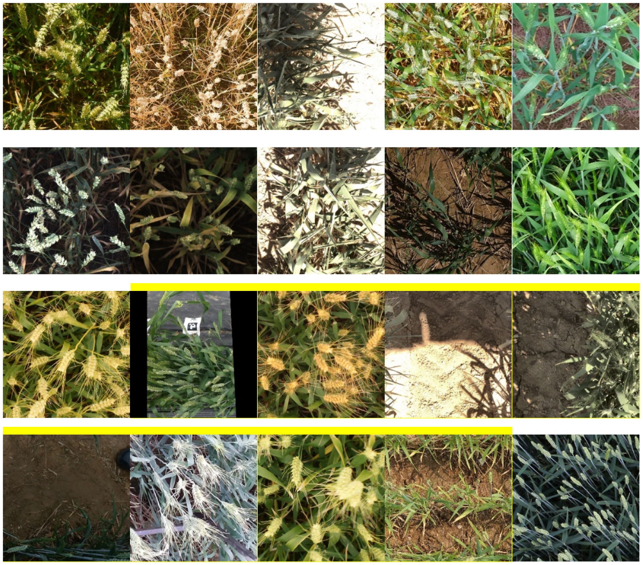 This study uses the 2021 GWHD (David et al., 2021) public dataset, which contains over 6,000 wheat spike images from 16 research institutions across 12 countries, with a resolution of 1024 × 1024. This dataset covers diverse wheat varieties, planting densities, growth stages, field conditions, and acquisition methods, as illustrated in Figure 1. The dataset was divided into training, validation, and test sets in an 8:1:1 ratio.