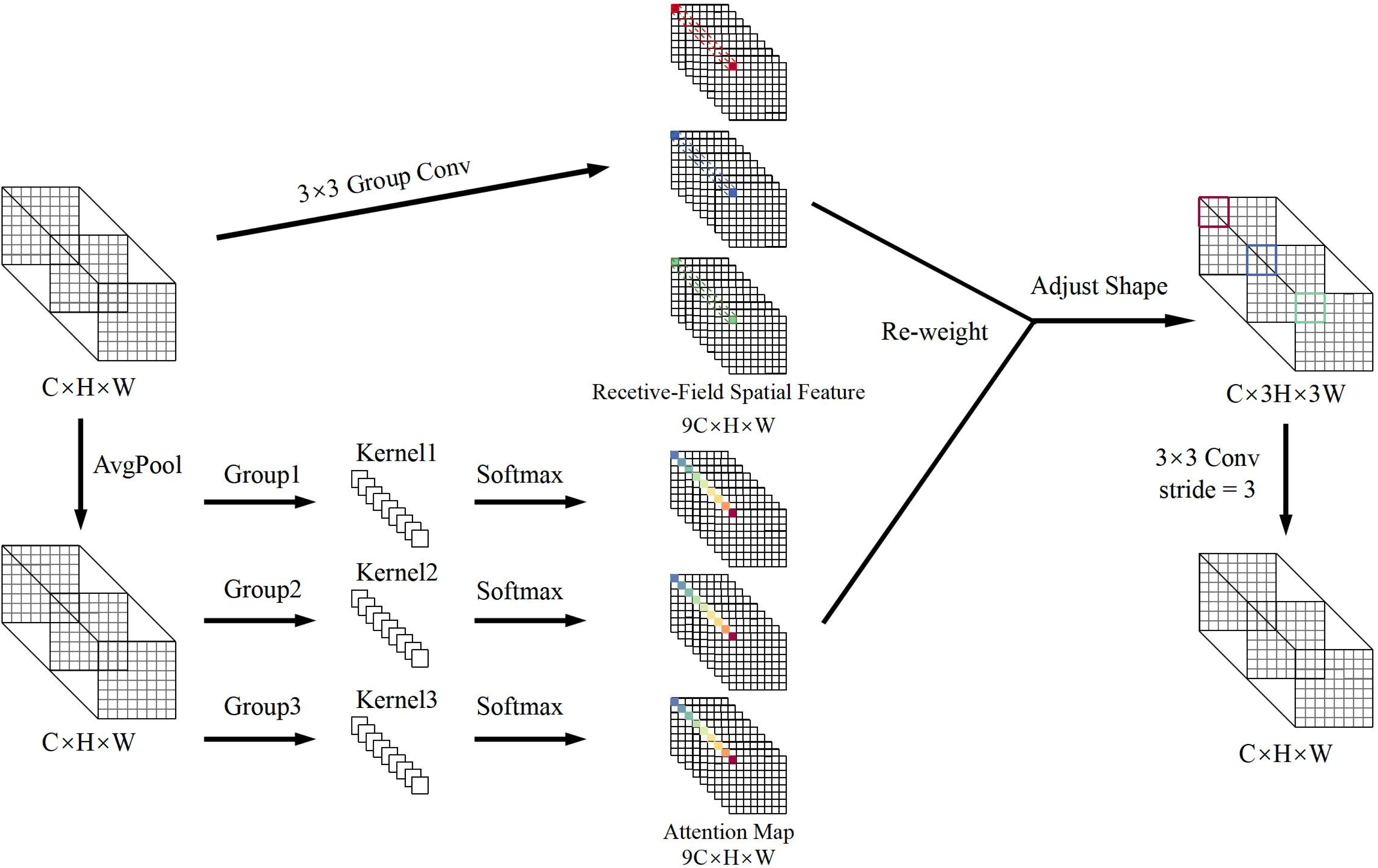 As shown in Figure 5, the spatial characteristics of the receptive field are composed of sliding windows that do not overlap 3 × 3, each window being responsible for extracting detailed information from local regions (Bertels et al., 2022). By introducing group convolution techniques, the module expands the feature set that matches the receptive field size and efficiently compresses the feature dimensions using fast group convolution algorithms. This process transforms the original features into a new representation enriched with spatial attention, providing more discriminative input for downstream tasks.