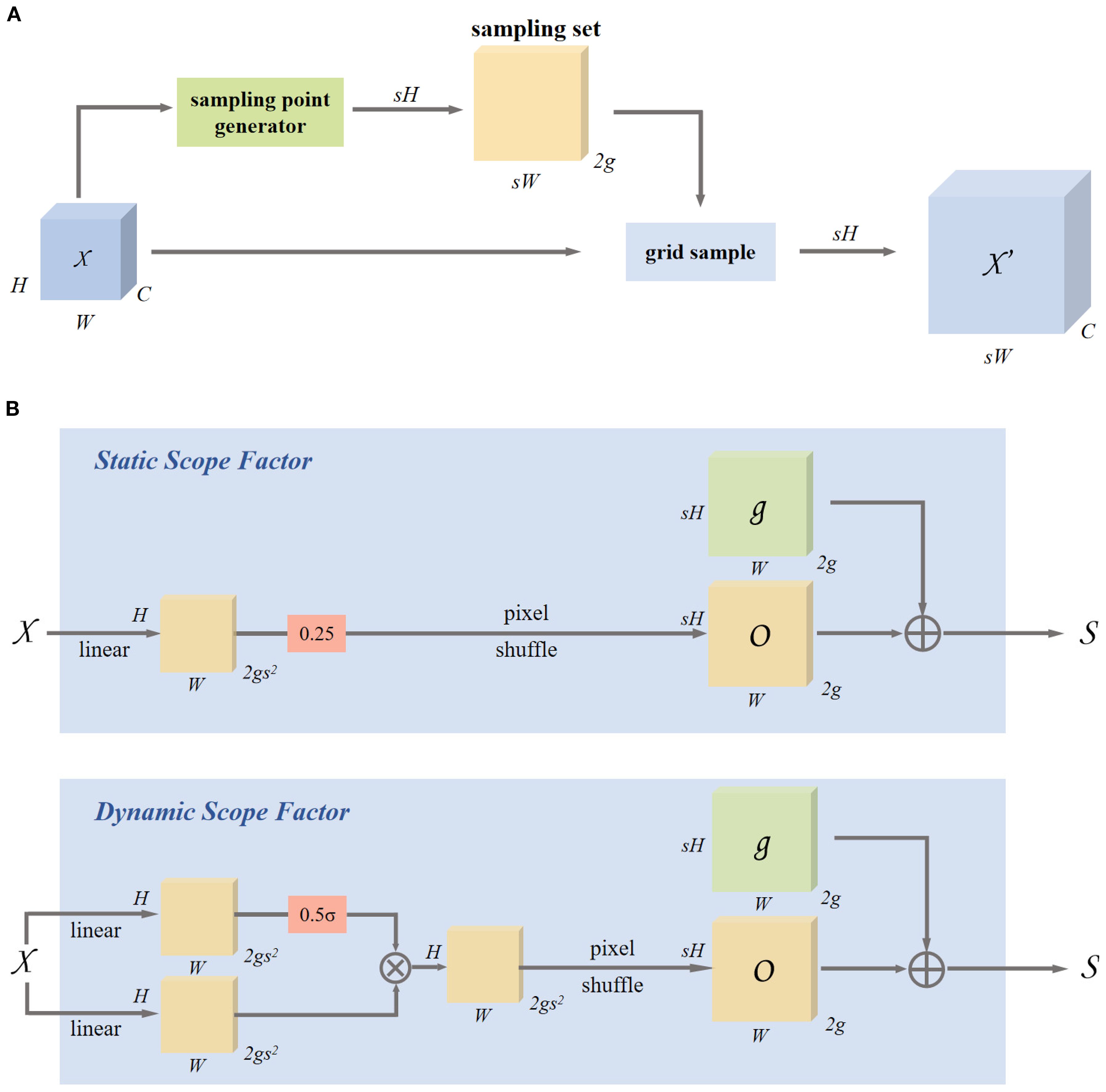 Figure 6. Dynamic upsampling based on sampling and module design in DySample. (A) Sampling based dynamic upsampling. (B) Sampling based dynamic upsampling.