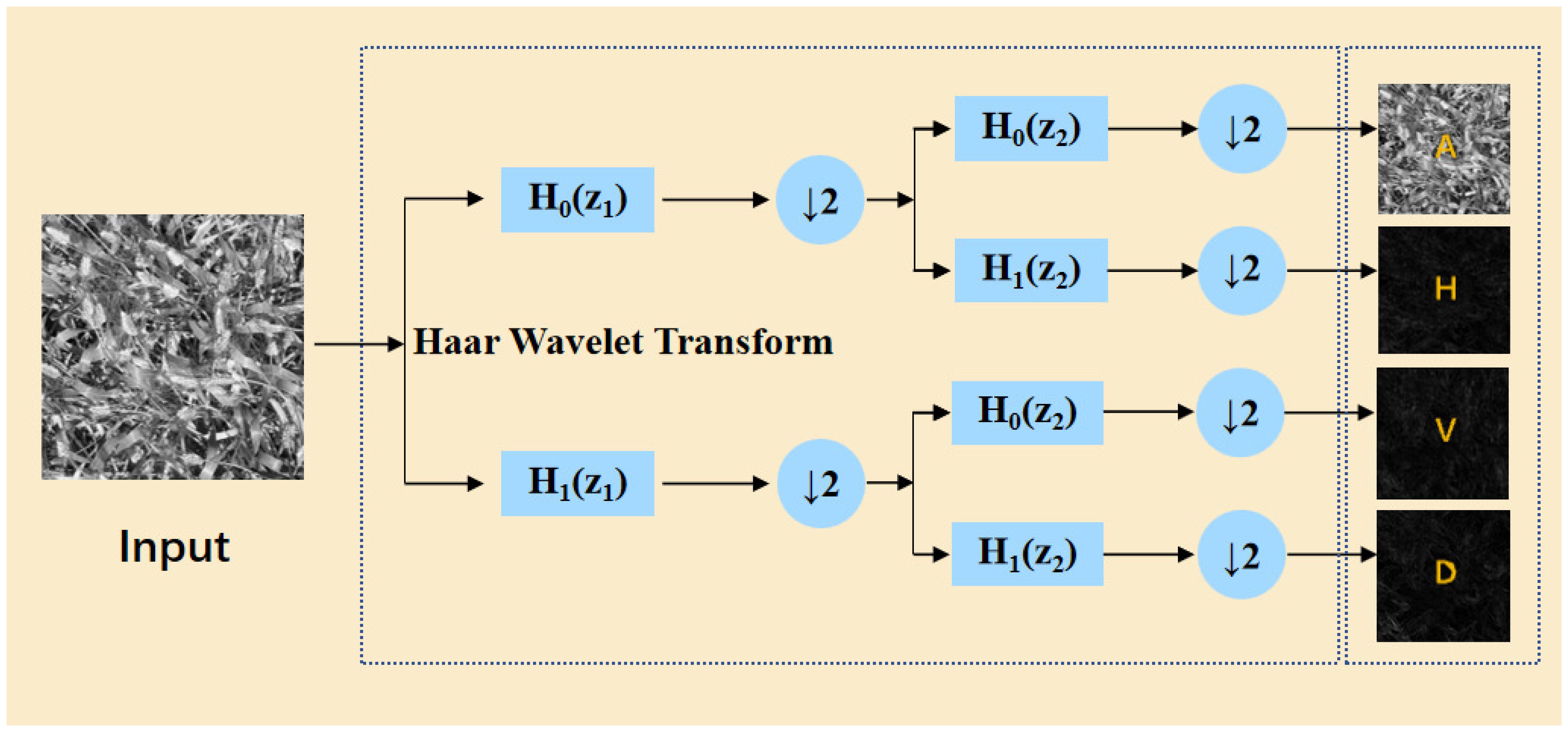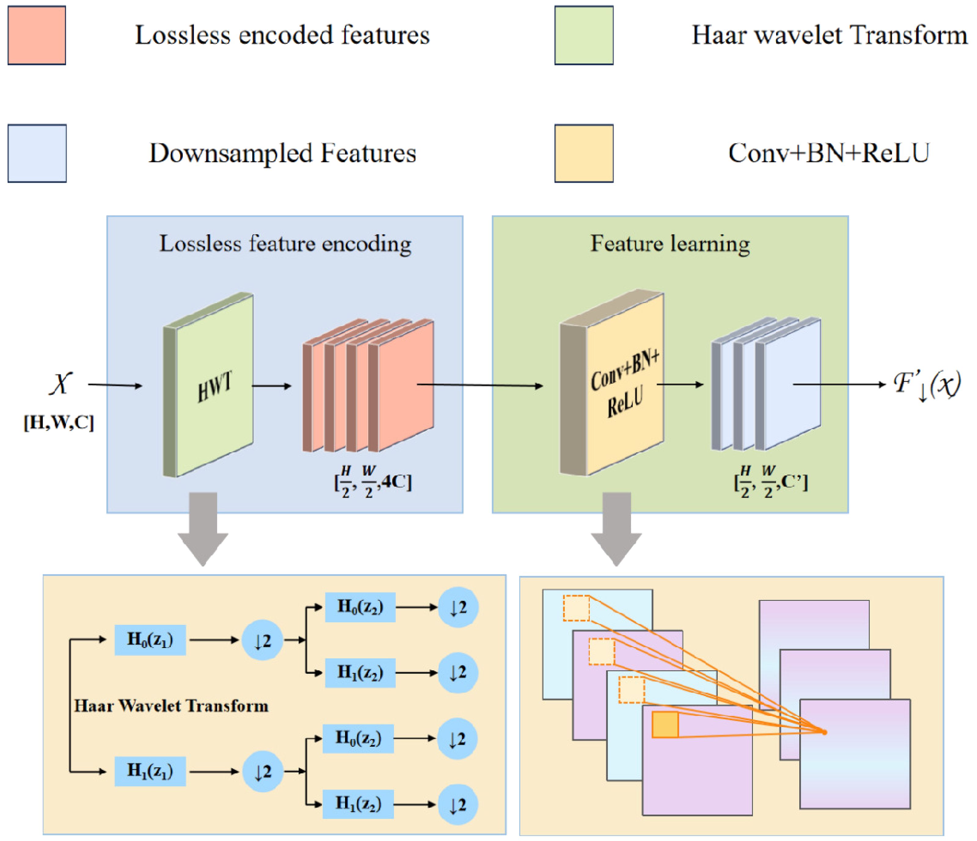 The essence of the HWD module is composed of a lossless feature encoding area and a feature learning area. The lossless encoding area utilizes the Haar wavelet transform, which, at the target resolution, applies cascaded high-pass (H0) and low-pass (H1) filtering followed by downsampling (↓ 2) to generate a low frequency approximation subband (A) and directional high-frequency subbands (horizontal-H, vertical-V, diagonal-D) are generated. This process, illustrated in Figure 8, preserves fine-grained features while compressing spatial resolution. As shown in Equation 5, the formulation of this process is presented as follows: