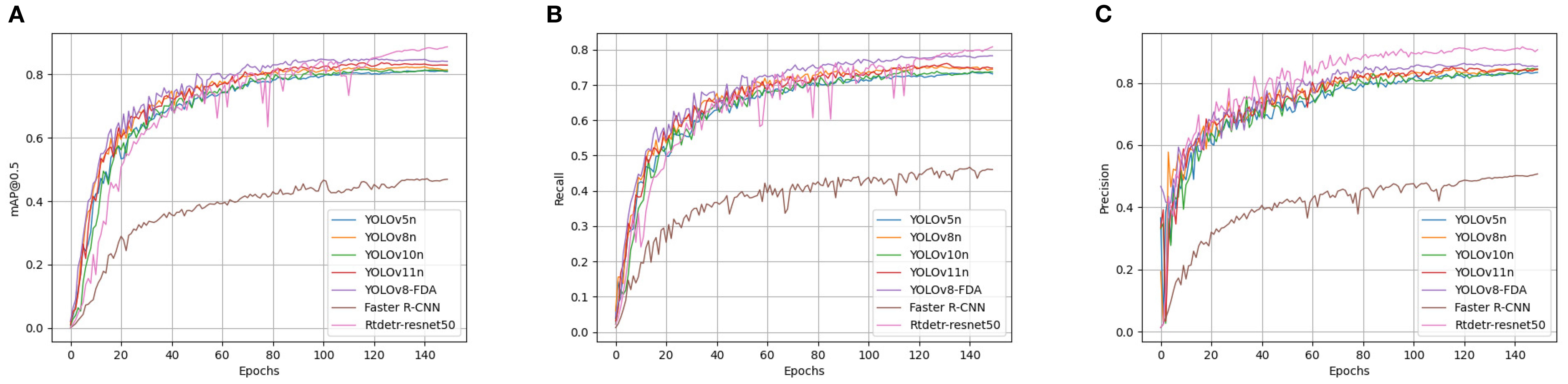 Figure 12. Comparison among the evaluation indices of diverse detection models. (A) Precision rate curves for each model. (B) Precision rate curves for each model. (C) mAP@0.5 curves for each model.