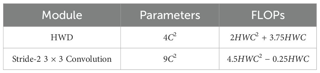 Given an input feature map of size H ×W × C, the downsampled output size is . Compared to traditional downsampling using a stride-2 3 × 3 convolution, the optimization of total parameters and FLOPs overhead in HWD is shown in Table 1.