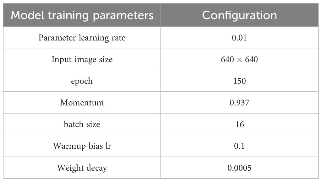 The training parameters listed in Table 3 were primarily based on the default recommendations of YOLOv8 (Yaseen, 2024). To ensure stable convergence on the GWHD dataset, several key hyperparameters, such as the learning rate and batch size, were empirically adjusted through preliminary experiments. This parameter selection strategy is consistent with previous practices in similar object detection studies (Li et al., 2024b).