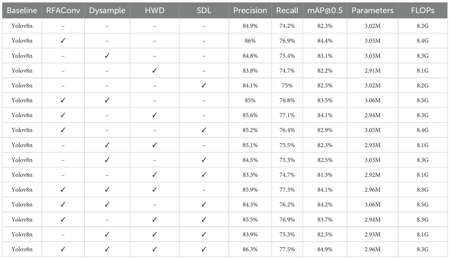 In addition to evaluating the performance of individual modules, we also considered combinations of modules to assess their synergistic effects. The combination of RFAConv and DySample, for example, resulted in a 2.2% increase in Recall, showing that these modules work well together to enhance the model’s sensitivity to small targets. Furthermore, the combination of RFAConv, DySample, and SDL demonstrated the greatest improvements, with both Recall and mAP@0.5 increasing significantly. These results highlight the importance of combining complementary modules for maximizing detection accuracy, particularly in complex wheat spike scenes with overlapping spikes. Overall, the combination of these modules leads to consistent improvements in both detection accuracy and computational efficiency, with the final model achieving 86.3% Precision, 77.5% Recall, and 84.9% mAP@0.5, as shown in the last row of Table 4.