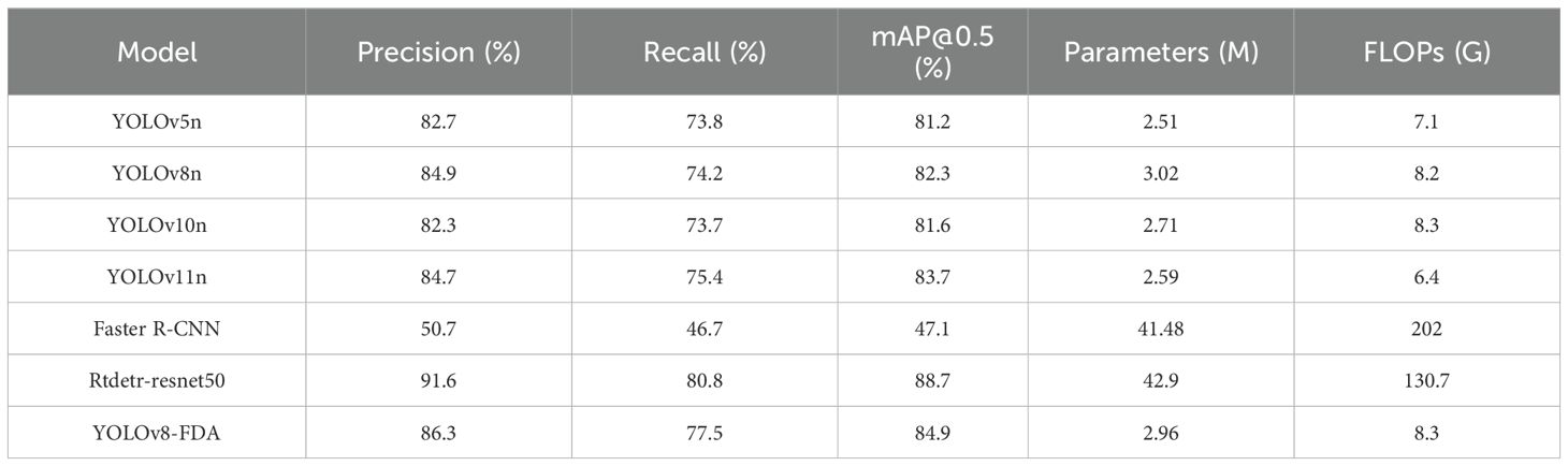 To verify the effectiveness of YOLOv8-FDA, it was tested and compared with models such as YOLOv5n, YOLOv8n, YOLOv10n, YOLOv11n, Faster R-CNN, and Rtdetr-resnet50. The results are shown in Table 5. YOLOv8-FDA achieves 86.3% Precision, 77.5% Recall, and 84.9% mAP@0.5, outperforming lightweight models such as YOLOv5n, YOLOv8n, YOLOv10n, and YOLOv11n in both accuracy and recall. Although YOLOv11 demonstrates stronger performance than YOLOv5, YOLOv8, and YOLOv10, and achieves this with fewer parameters and FLOPs, our goal is to enhance the performance of lightweight baselines that are widely deployed in practice. Therefore, YOLOv8n was selected as the core baseline for improvement, as it represents a balance of simplicity, efficiency, and relevance for lightweight enhancement (Lu et al., 2023).