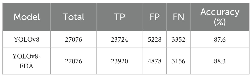 Discussion: The proposed YOLOv8-FDA model demonstrates strong detection performance, lightweight characteristics, and efficient real-time capability, indicating its high practicality and suitability for deployment in real-world agricultural applications.