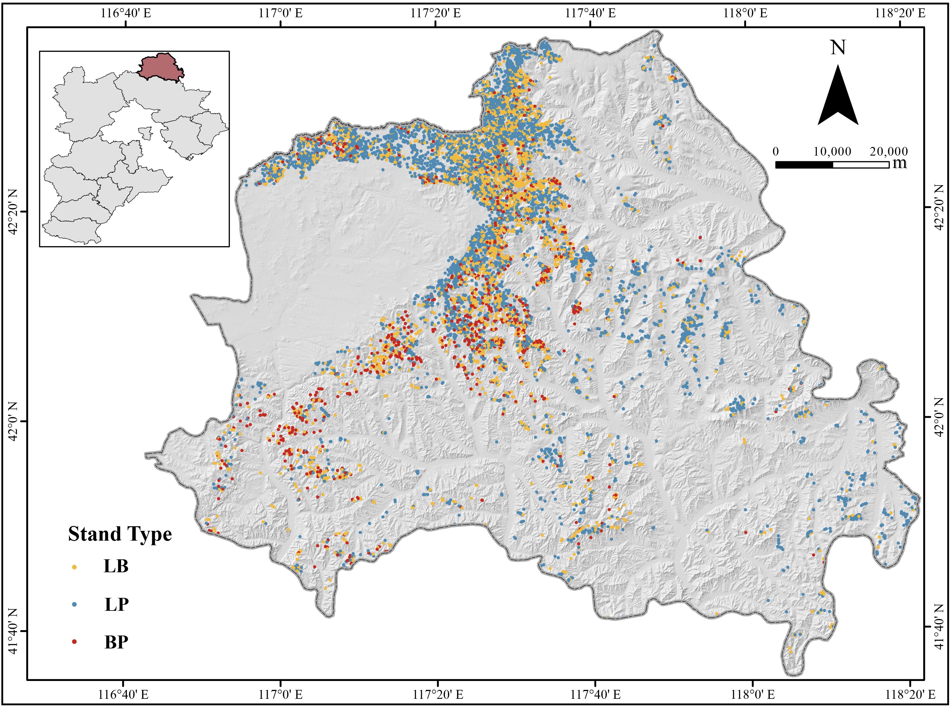 Figure 1. Geographical location of the study area and distribution of sample plots. LP, Larix principis-rupprechtii pure forest; BP, Betula platyphylla pure forest; LB, mixed L. principis-rupprechtii–B. platyphylla forest.