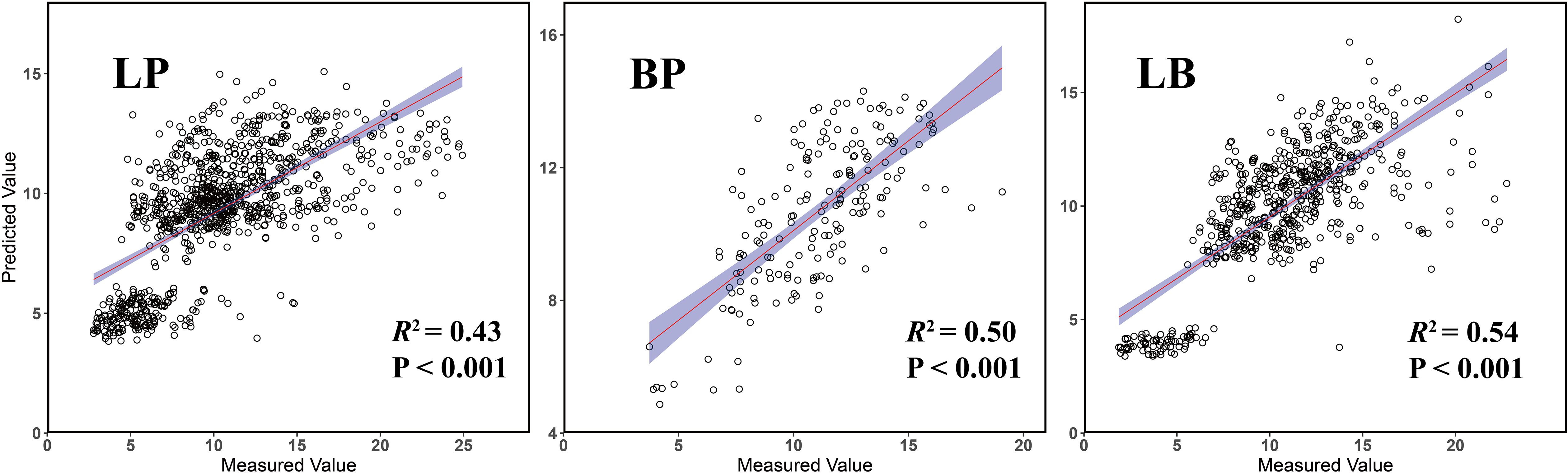 Model performance was further evaluated using an independent test set (Figure 3). The LB model achieved the highest predictive accuracy, with an R2 of 0.54, RMSE of 2.73, and MAE of 1.91. The BP model followed, with an R2 of 0.50, RMSE of 2.05, and MAE of 1.64, while the LP model showed the lowest performance, with an R2 of 0.43, RMSE of 3.53, and MAE of 2.49. Additionally, residual analyses of the test set revealed no significant spatial autocorrelation across all three models (Supplementary Figure S7), indicating that the predictions were not influenced by spatial dependencies and confirming the models’ robustness and generalizability.