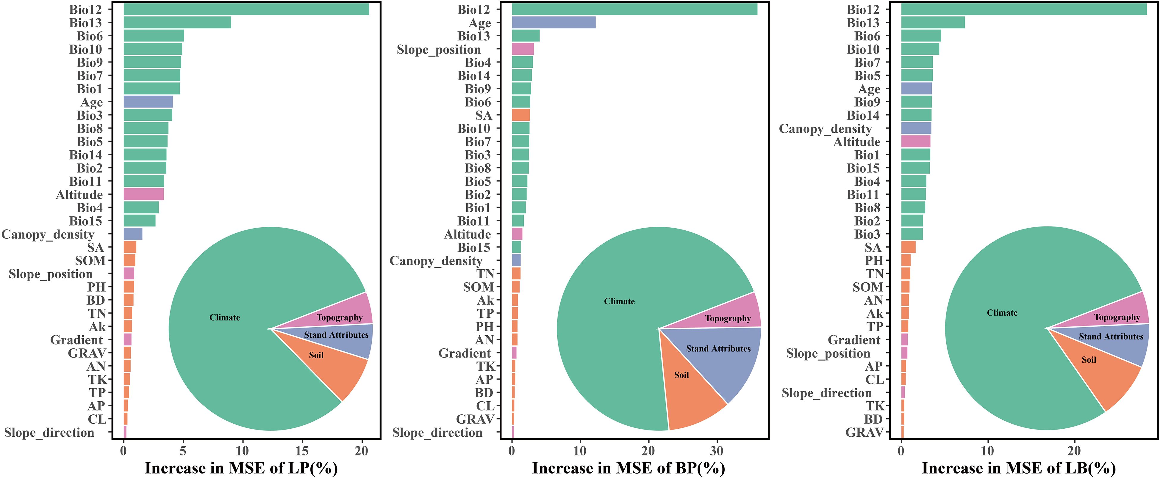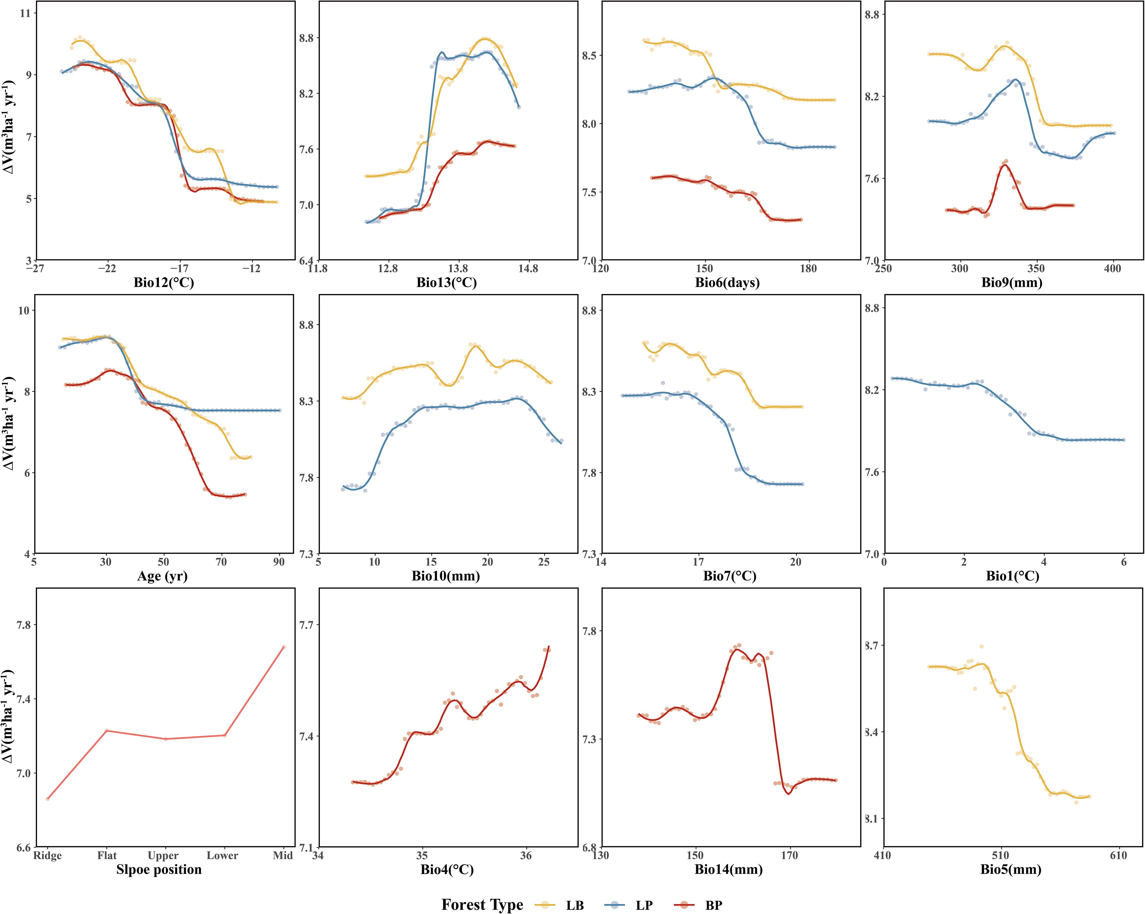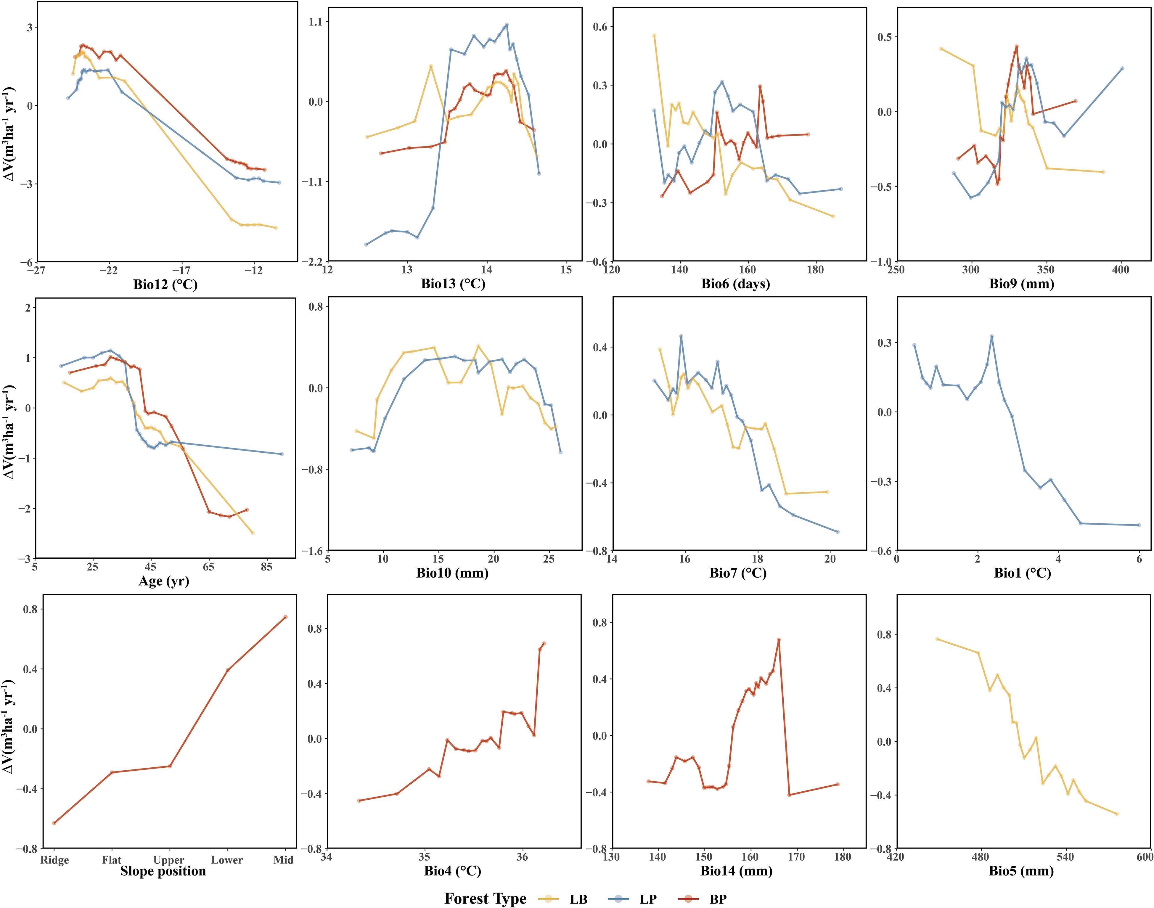 Among the three forest types, the LB stands exhibited the highest stand volume growth (ΔV). All three models showed a fluctuating decline in ΔV in response to Bio12 (Figure 8). The distribution of Bio12 was bimodal, concentrated in both low and high value ranges (Figure 9). When Bio12 was in the lower range, ΔV increased, while it declined at higher Bio 12 values (Supplementary Figures S8-S10). The response of ΔV to stand age showed a unimodal pattern across all forest types, peaking at approximately 30 years and gradually declining thereafter. The response of ΔV to Bio6 was also sensitive, with LB showing the highest ΔV in the high-value range of Bio6, while LP and BP exhibited the highest ΔV at intermediate Bio6 values. BP showed greater sensitivity to slope position, with higher ΔV observed at mid- and lower-slope positions.