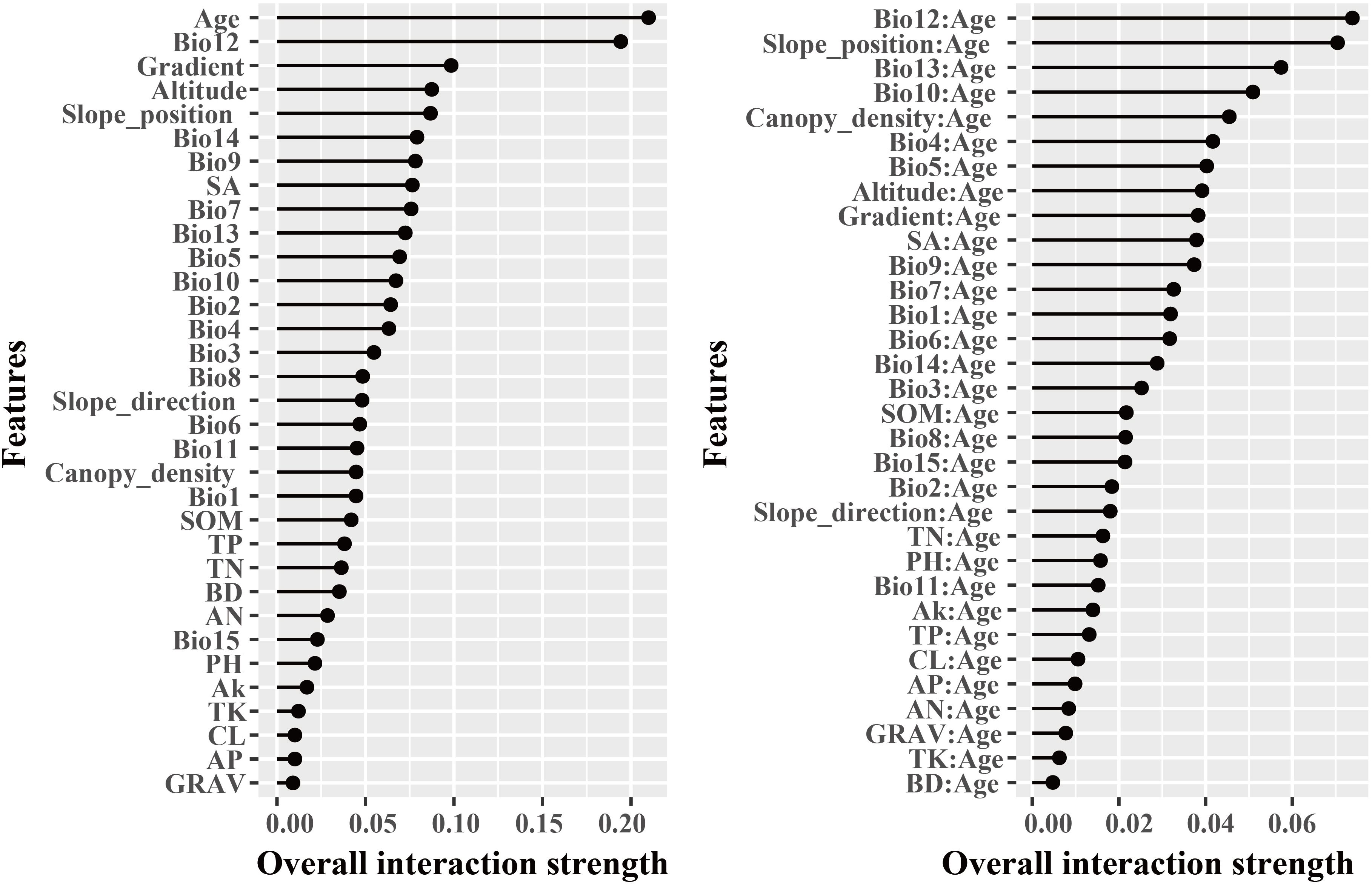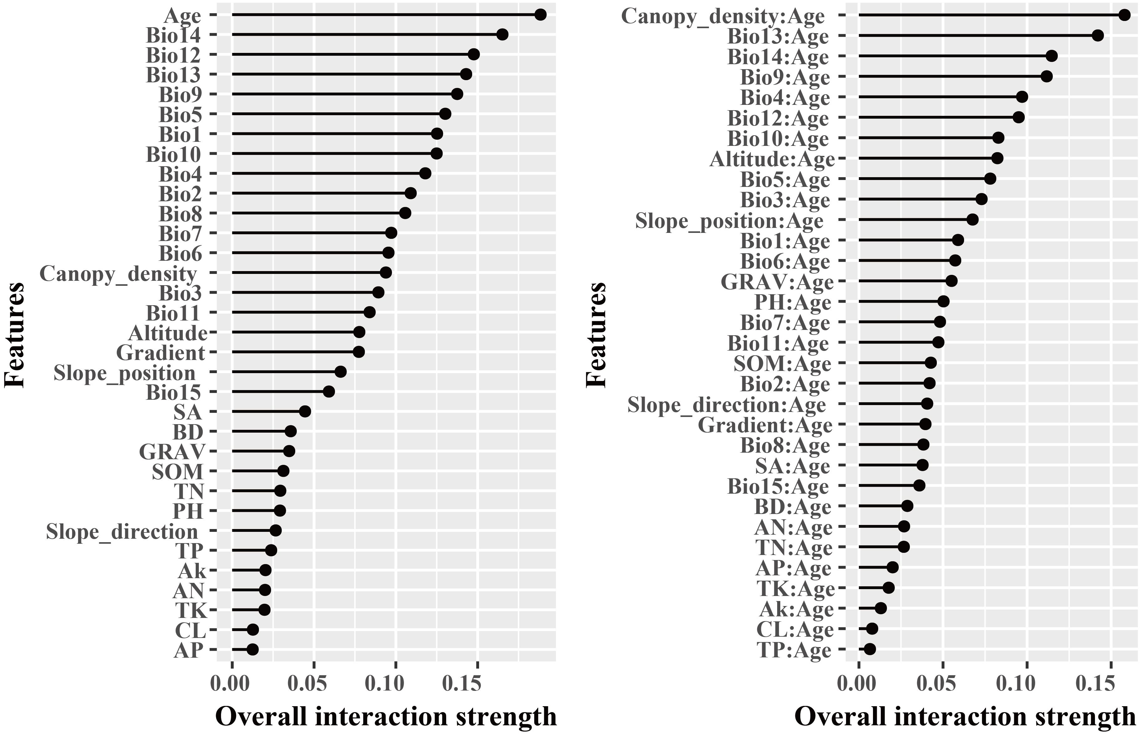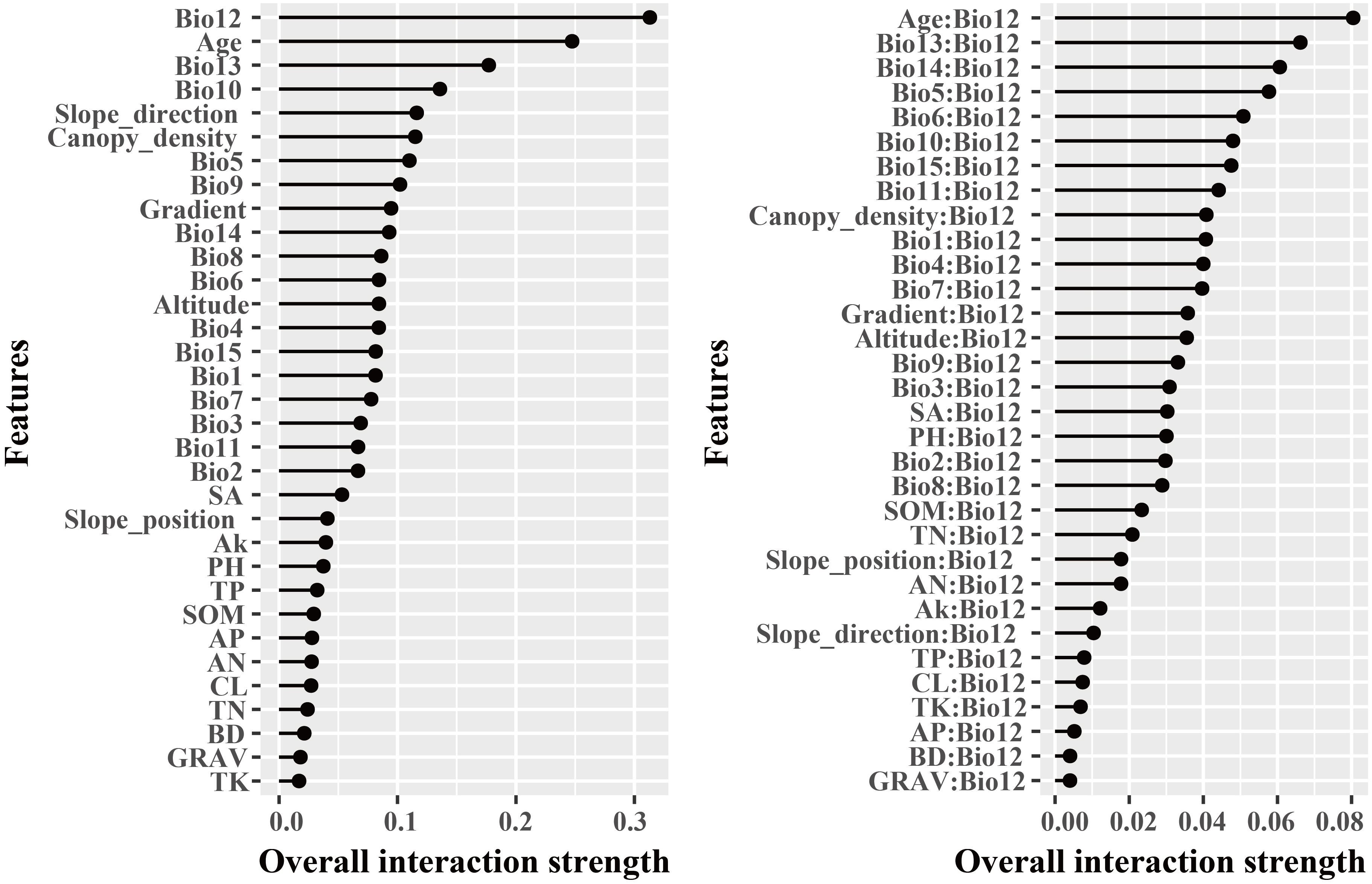 The dominant factors influencing stand volume growth were generally consistent across the three forest types, with the minimum temperature of the coldest month (Bio12) identified as the most influential predictor in all models (Figure 4). Specifically, Bio12 contributed 20.6%, 35.9%, and 28.3% to the total relative importance in the LP, BP, and LB models, respectively. Friedman’s H-statistic further revealed that stand age exhibited the strongest overall interaction effects in the LP and BP models, with H values of approximately 0.2 in both cases (Figures 5, 6). In the LP model, the most pronounced interaction occurred between stand age and canopy density (H = 0.16), whereas in the BP model, the interaction between stand age and Bio12 was dominant (H = 0.07). In contrast, the LB model showed that Bio12 had the highest overall interaction strength (H = 0.31, Figure 7), with its strongest interaction observed with stand age (H = 0.08).