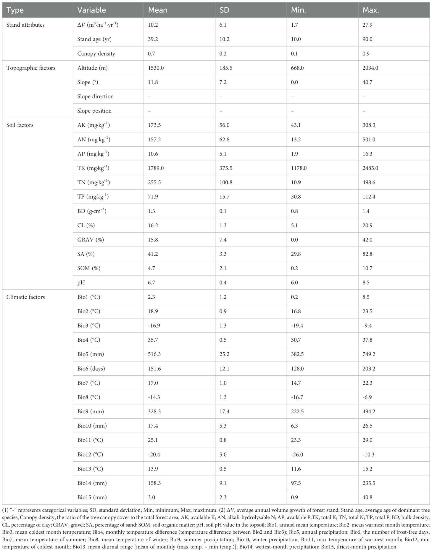Bioclimatic data were obtained using ClimateAP software (v3.10) (http://ClimateAP.net). ClimateAP provides location-specific monthly and seasonal climate variables across the Asia-Pacific region for the period 1901–2100 (Wang et al., 2017b). For each plot’s specific growth period, a corresponding time series of annual climate data was obtained. The annual values of each climatic variable were then averaged over the growth period, resulting in a dataset comprising 15 time-averaged bioclimatic variables for each sample plot (Table 1).