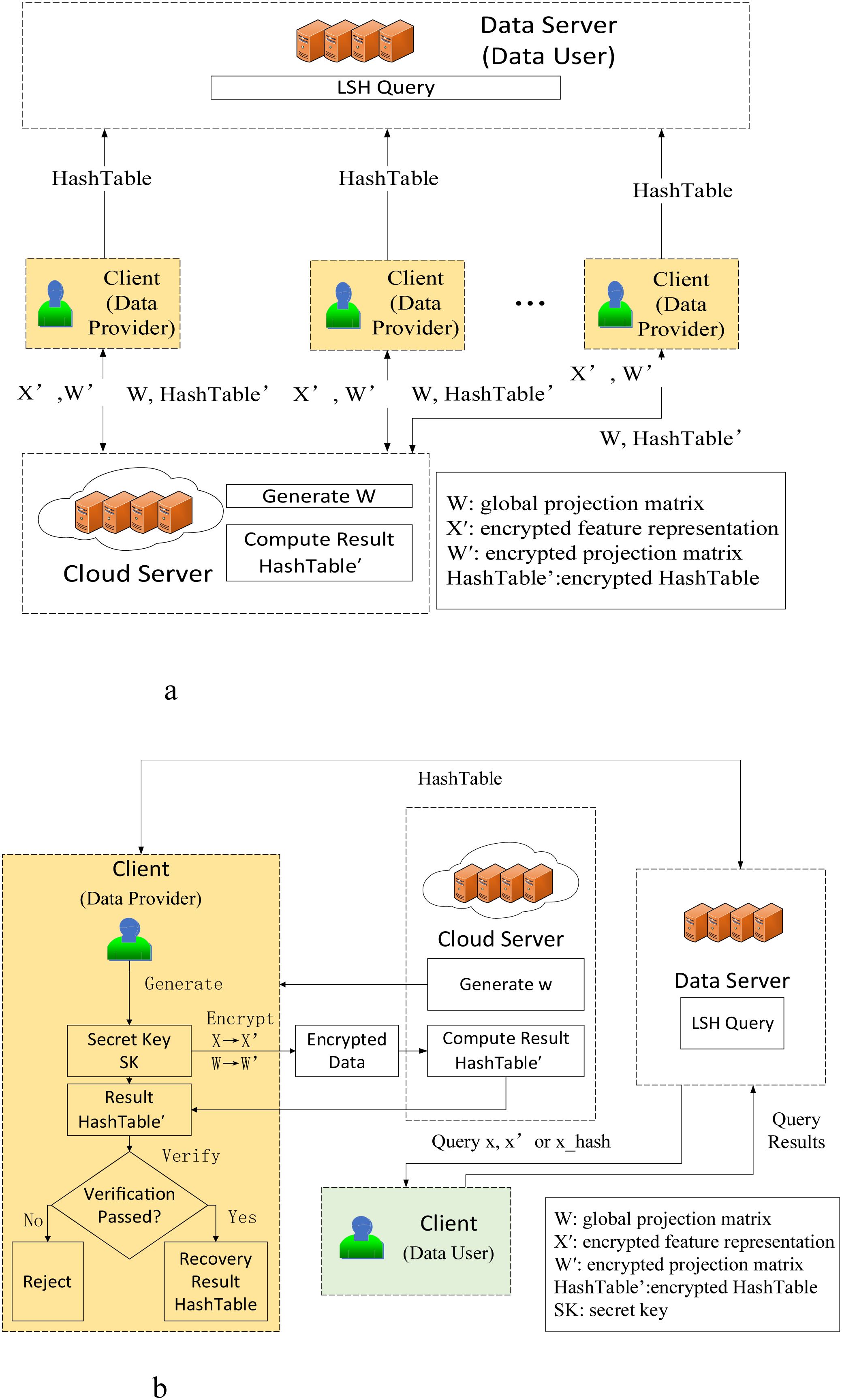 To conduct batch queries of similar data, the Client can leverage the Cloud Server to generate a cloud-assisted batch query data . The Cloud Server generates through the privacy-protected cloud-assisted machine learning algorithm proposed above. The Client then verifies and restores the original and sends it to the Data Server for rapid LSH-based similar data queries.