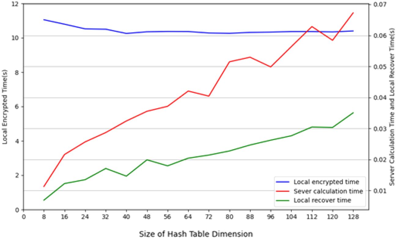 Figure 3. The running time of different-sized hash table on the client and cloud server on CIFAR-10 dataset.