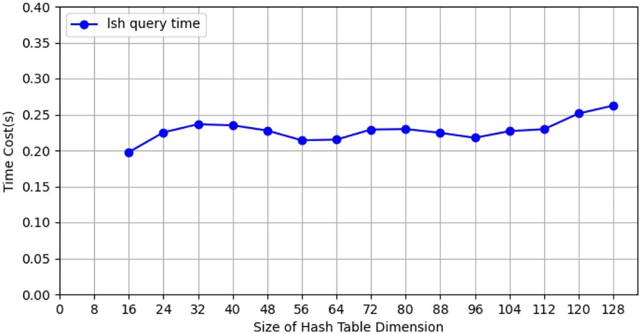 During the testing process using the CIFAR-10 dataset, we conducted tests with the CIFAR-10 training dataset (50, 000 images), employing 10 client nodes for federated learning LSH algorithm testing, with each client containing 5,000 images. Performance tests were carried out on both the client and Cloud Server ends using different hash sizes. All experiments were repeated 10 times with different random seeds, and results were averaged for final reporting. The specific results are shown in Figure 3. The query efficiency at the Data Server end is presented in Figure 4, and the performance of hit rate providing 4 candidate results is shown in Figure 5.