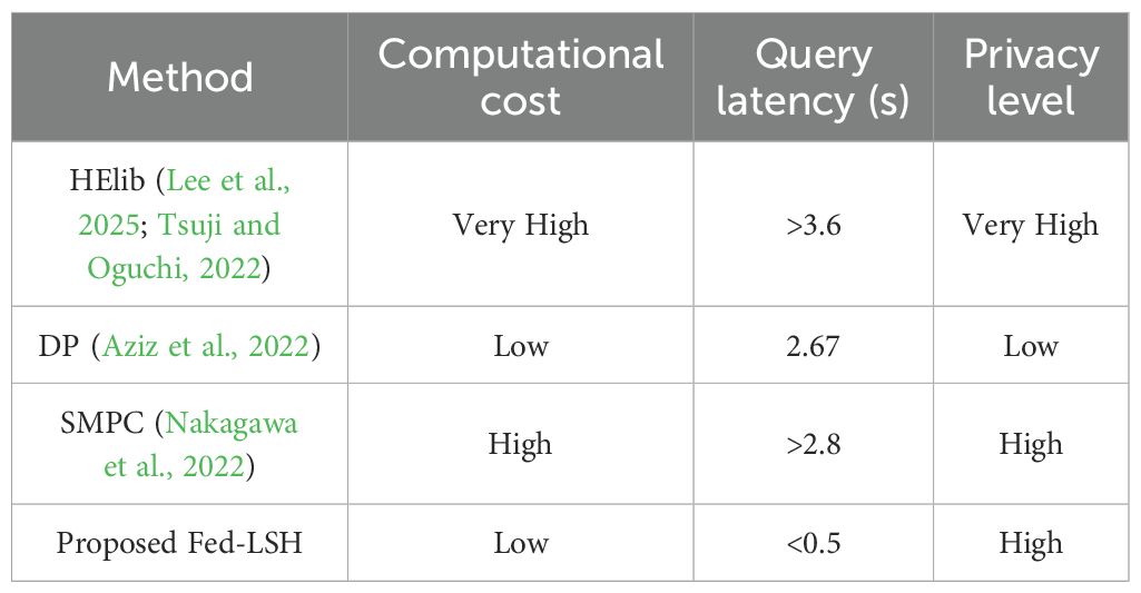 Tables 2–4 compares the performance of the Proposed Fed-LSH with other privacy-preserving methods (HELib, DP, SMPC) in terms of computational cost, query latency, and privacy level. The Proposed Fed-LSH achieves low computational cost and low query latency (<0.5s) while maintaining a high privacy level. In contrast, HELib has very high computational cost and long query latency (>3.6s) but high privacy; DP offers low computational cost and low latency (2.67s) but only low privacy; SMPC has high computational cost, long latency (>2.8s), and high privacy. Thus, the Proposed Fed-LSH demonstrates a better balance among computational efficiency, query speed, and strong privacy protection.