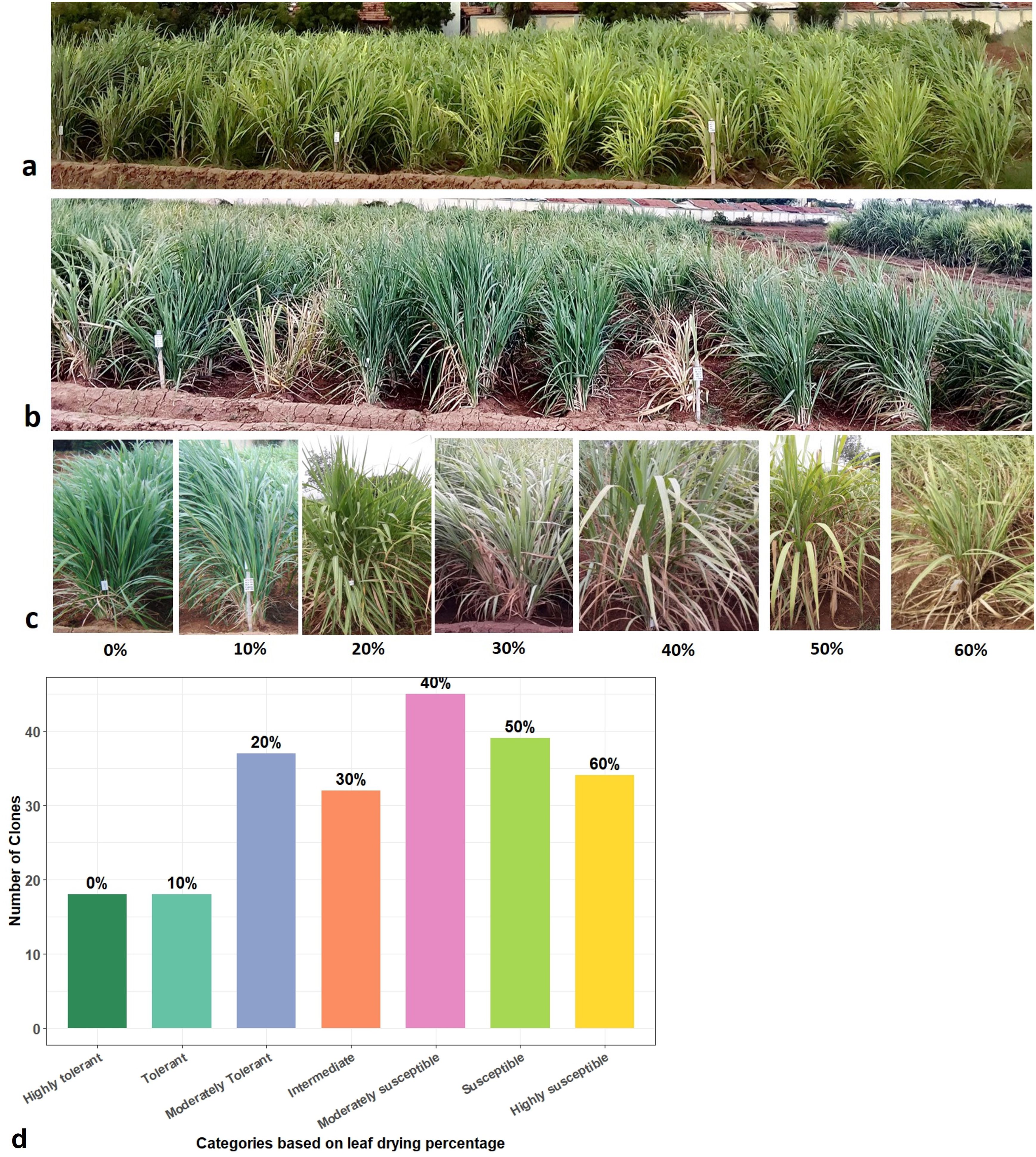 Figure 1. Field evaluation of Erianthus clones for drought tolerance response. (a) Erianthus clones under irrigated control conditions. (b) Erianthus clones showing leaf drying symptom under drought stress conditions. (c) Leaf drying percentage and morphology. (d) Distribution of germplasm accessions grouped based on leaf drying.